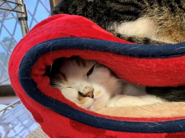 大多數的貓喜歡高處,所以像這種具有屋頂的圓頂形貓床時,經常會看到貓咪跑到屋頂上放鬆的情況,他們不一定會躲進去裡面。結果 みふゆ(三冬) 其中一隻貓咪就跑上去了,把小暖窩給壓扁了 XD,而且裡面還有一個小夥伴在裡面睡著,他也只能說 : 「這是一個使用不當的案例。」
