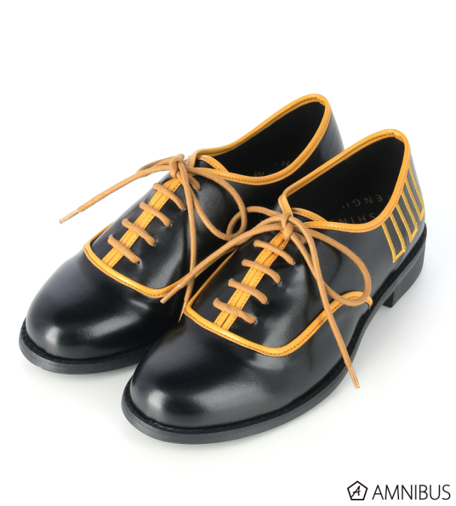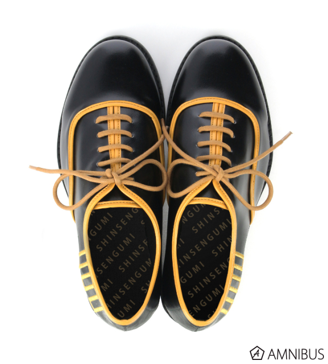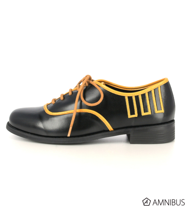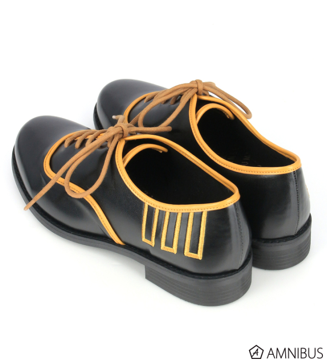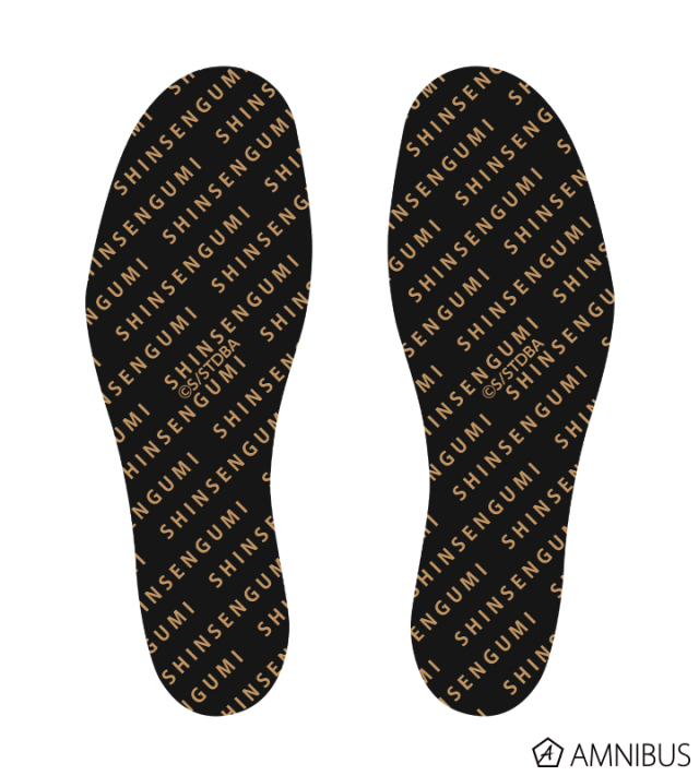 真選組的制服以黑色配上類金色的條紋線條裝飾,AMNIBUS 這款鞋子也同樣以此為設計,圓形的楦頭方便穿搭,鞋墊也印上的滿版的新選組假名發音,不論正式場合或是休閒穿著都能輕鬆上手。成熟且高貴的氣息確實讓人難以忽視,如能搭配制服更可以展現出不凡的魅力 XD ( 小編喜歡沖田總悟啊~~~ )。