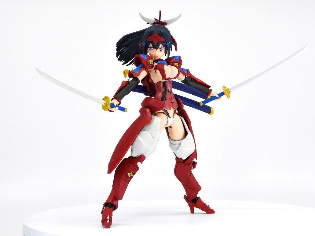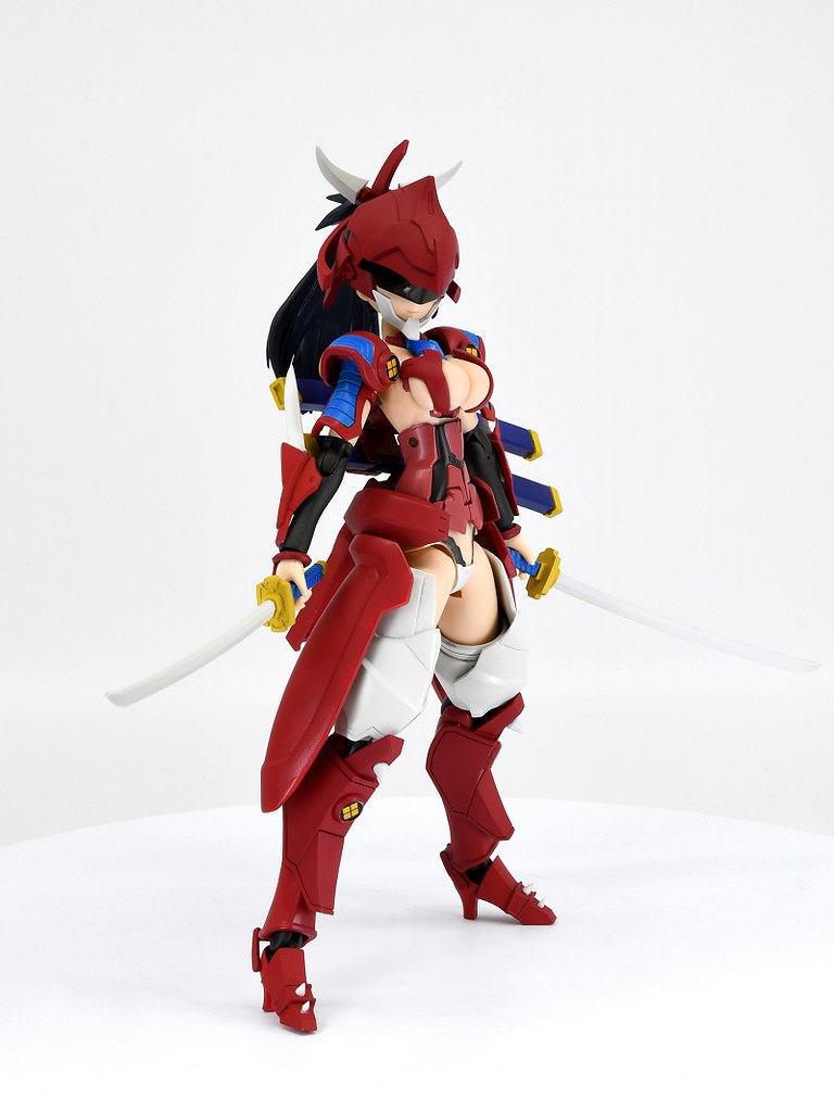 這款鎧傳的「烈火之遼」造型之改裝套件,是針對壽屋之前曾經發售過的骨裝機娘之「祈仙蒂亞」(イノセンティア)這款商品,想要遊玩本套件,就得先購入該款骨裝機娘。請來名漫畫家「貞松龍壹」所設計的這款套件,內容很豐富,有八種顏色的分件,總共 107 個零件(包含兩種表情零件),以及 5 個合金零件,還有一張水貼。可以把原本的骨裝機娘素體給徹底改造一番,搖身一變成為身披紅色鎧甲手持雙刀的帥氣武士!