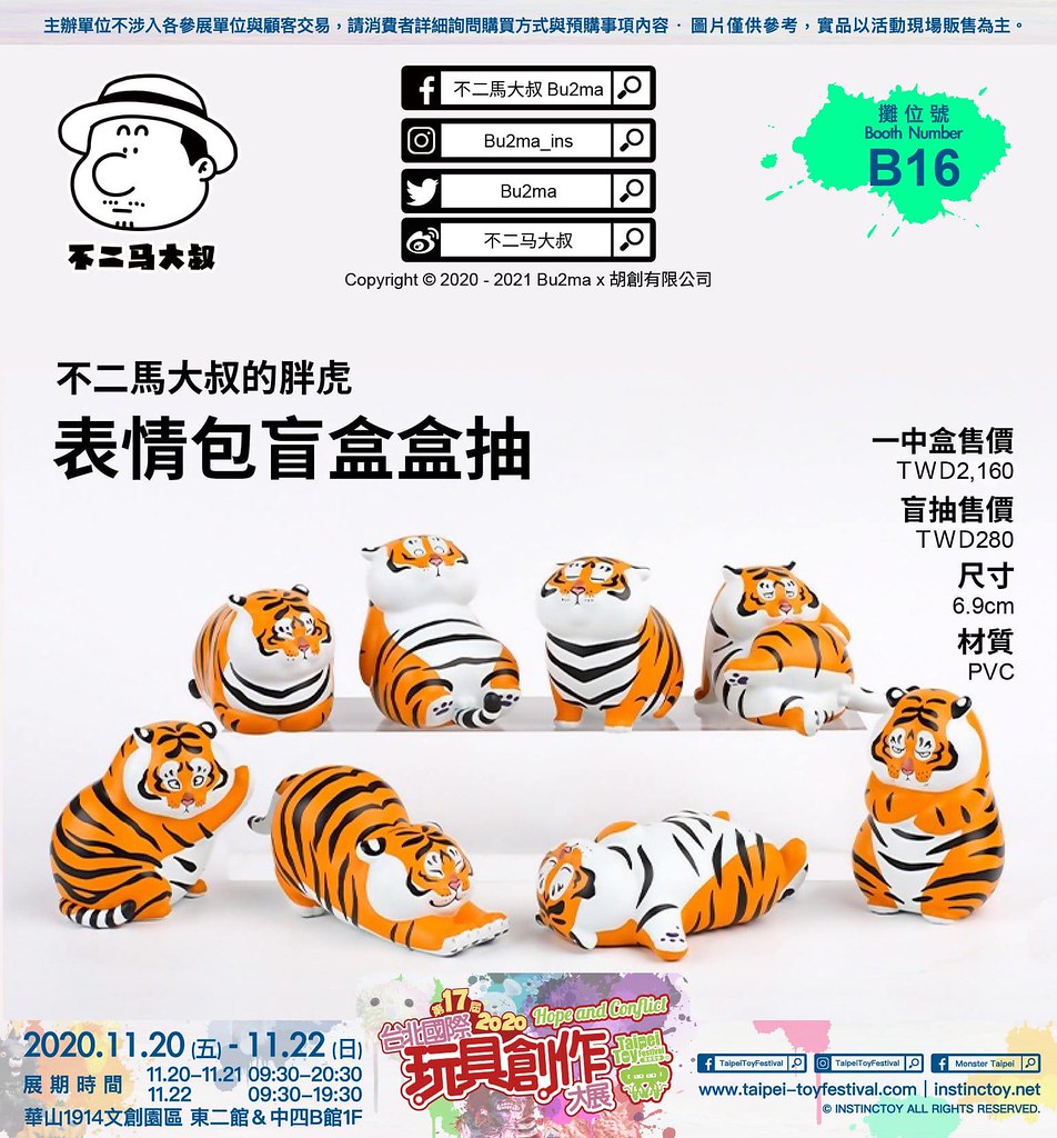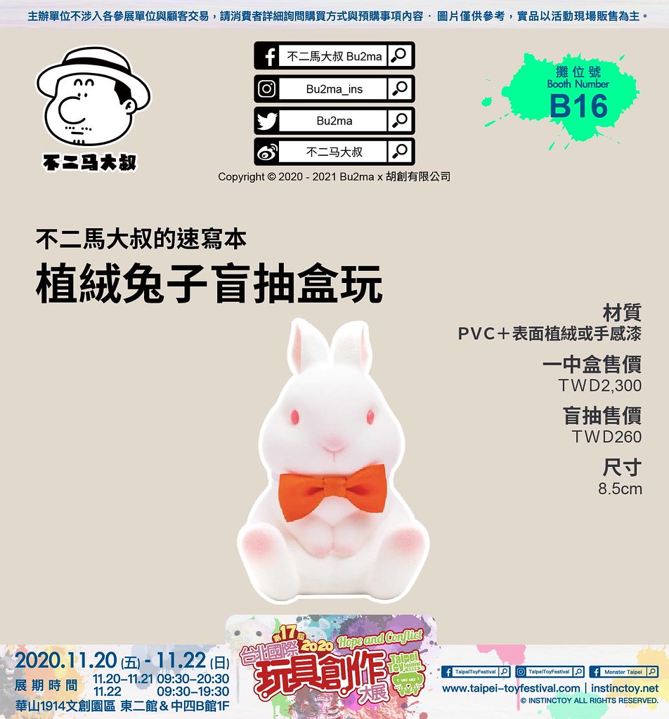 這次不二馬大叔將在TTF 2020 展場帶來多款豐富的作品,備受矚目的「胖虎表情包盲盒盒抽」共有八款超可愛的胖虎,尺寸最高約6.9cm,一抽一抽NT$280元登場~而植絨的「兔子包盲盒盒抽」、「吃貨倉鼠包盲盒盒抽」則是各一抽 NT$260 元,會場數量有限,抽完為止。