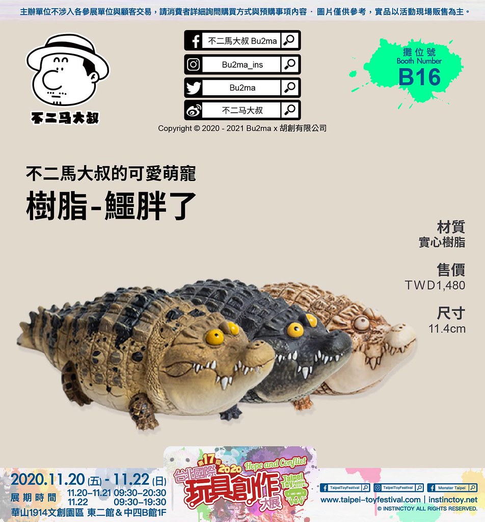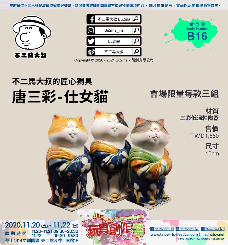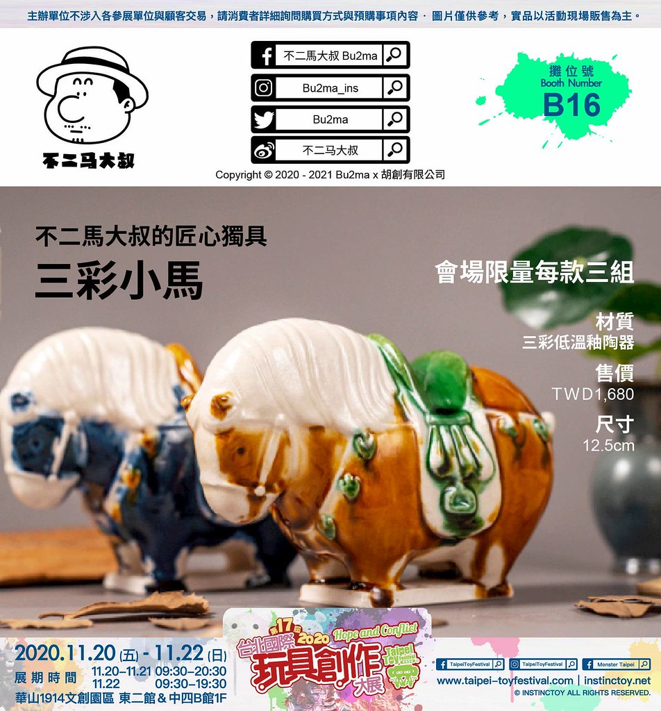本篇將帶來 Booth No. B16 參展單位-超人氣的不二馬大叔展場開售商品「胖虎表情包盲盒盒抽」、「吃貨倉鼠/植絨兔子包盲盒盒抽」、「鱷胖了」公仔,以及會場限量每款三組的限定品「唐三彩 三彩小馬」&「唐三彩 仕女貓」等精彩作品!