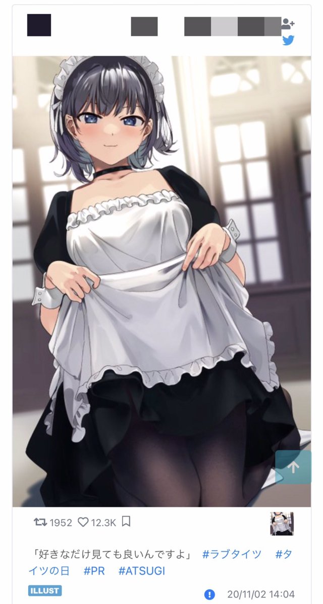 據了解,在這兩張作品當中,一張是穿著女僕裝的少女主動撩起裙子露出雙腿的絲襪,另一張則是穿著校服的美少女以性感的姿勢,同樣也是微微拉起裙子露出黑色絲襪,而因為這兩張作品,讓女性族群及ATSUGI消費者紛紛提出抗議,譴責利用宣傳表達意淫的行為,眼看炎上情勢越演越烈,ATSUGI官方也趕緊將兩張具有爭議的作品從推特上刪除。