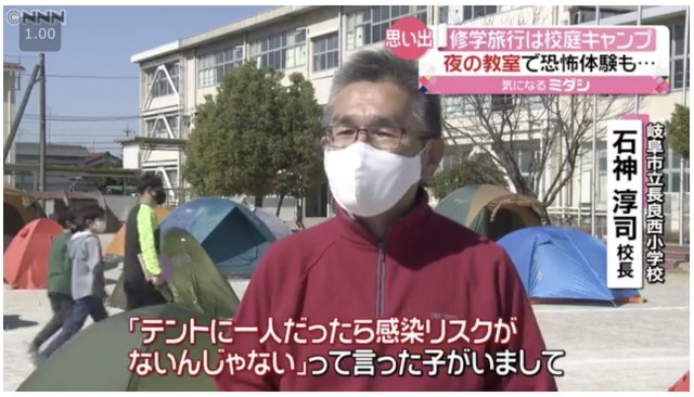 石神淳司校長表示 : 「當時有位學生代表到校長室提議 : 『如果每一個人都住在帳篷裡,是不是就不會有群聚感染的危險了。』,當時聽到這個建議的我也覺得這未嘗不是一個好主意,於是匯集了師長與學生的意見,就決定在學校當地進行露營。」