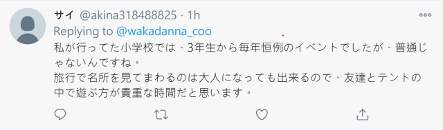 或許聽起來在學校搭帳篷辦試膽大會聽起來好像沒有太特別,但面對疫情可以做出這種折衷的方式,也讓學生與師長們得到快樂以及大家的鼓勵,小編也認為他們的做法非常激勵人心。在台灣目前因為疫情控制得宜,目前雖然出國較為困難,但國內旅遊都還非常安全,在日本並非如此,只能透過這類的方式折衷。也希望日本能夠盡速脫離疫情壟罩,讓這些學生們可以一起快快樂樂地去修學旅行~。