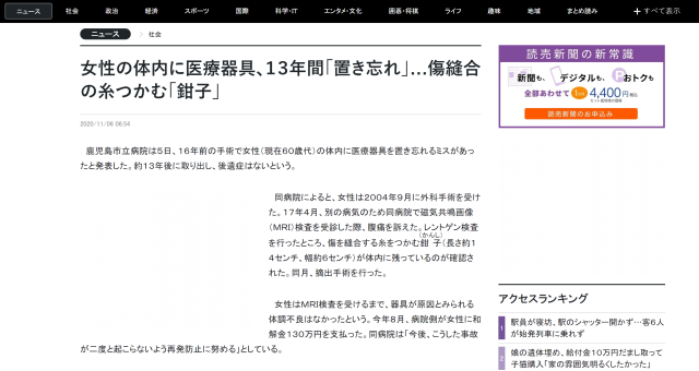 日本鹿兒島於昨日 ( 11 月 5 日 ) 傳出一則駭人的消息,據日本讀賣新聞報導,鹿兒島醫院於 16 年前的一次手術中,因為過程的疏失將醫療器材「鉗子」放置在患者的體內長達 13 年,其後才透過手術將其取出,沒有造成後遺症。這則新聞也讓日本推特上許多網友討論,形容這件事情 : 「這不是怪醫黑傑克的情節嗎?」