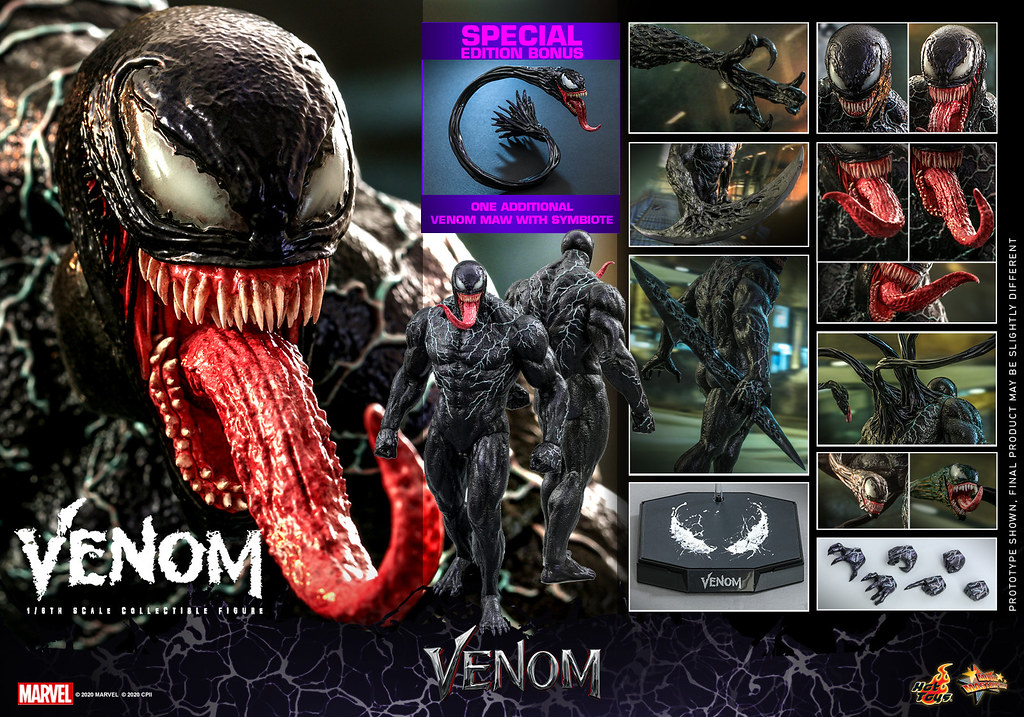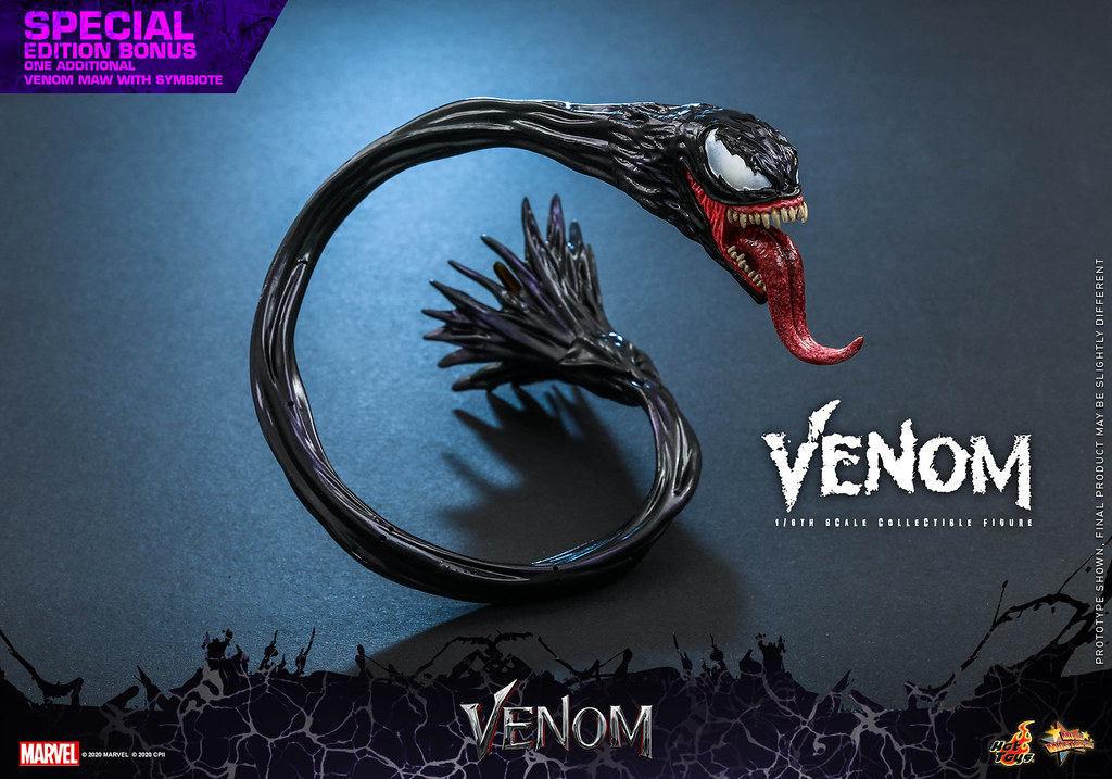 頭雕共有咬牙、張嘴兩種,張嘴頭雕更有三種形狀相異的舌頭零件可以替換,其餘配件包含可裝備在右手臂上的鐮刀(Sickle)、可裝備於左手臂上的延伸爪、一把共生體形成的刀,以及可裝備在猛毒身後、內藏鐵絲可彎曲的共生體組件;另外,在 Hot Toys Secret Base、銅鑼灣商場的 HT20THPlus 店鋪預訂還可額外獲得一個可裝備於背上、呈現吐舌造型的猛毒共生體配件。