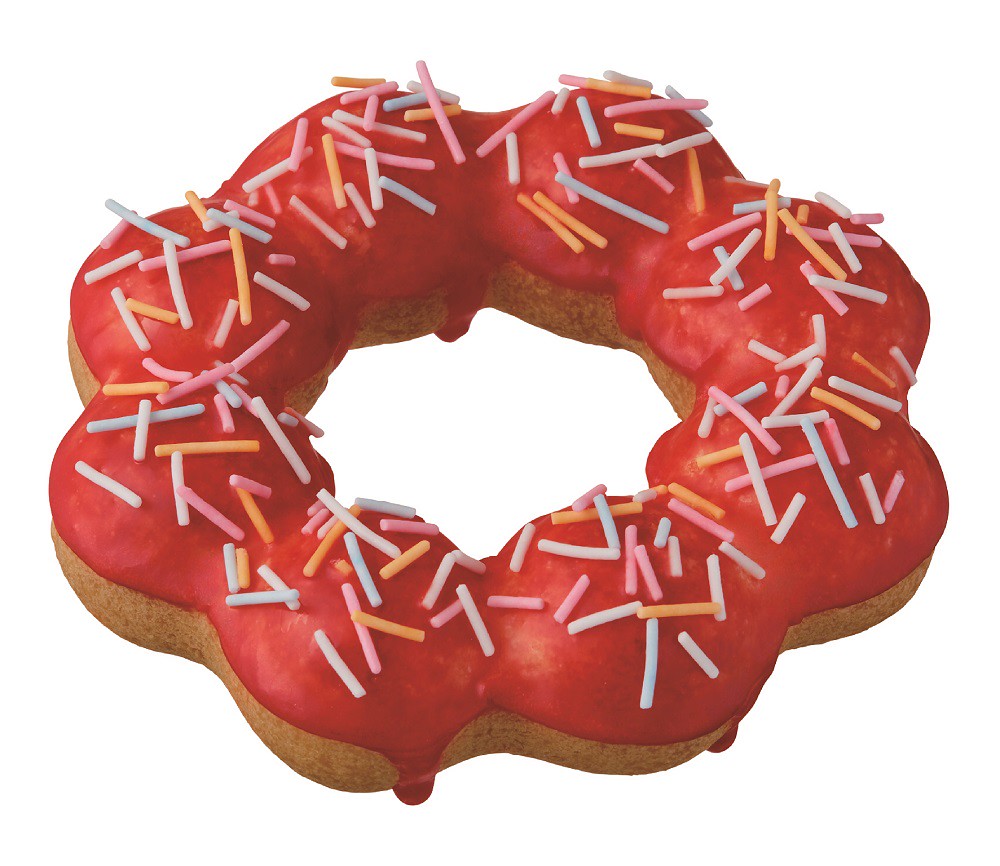 用草莓巧可力呈現吉利蛋的粉嫩粉紅色~吉利蛋圓滾滾的身型化身甜甜圈毫無違和感~小小的微笑表情直接萌到融化~更用波堤當成肚子上的蛋造型,創意又可愛!