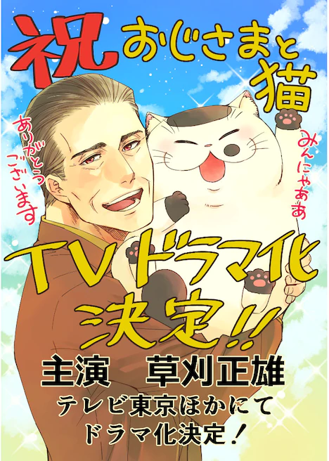 以櫻井海為原作漫畫的《大叔與貓》於今日正式日劇化決定。並且主演將由草刈正雄來擔任。日劇將會於 2021 年 1 月 1 日元旦當天在Paravi網站上先行播出,而正式版將會於 1 月 6 日在東京電視台上深夜放送。