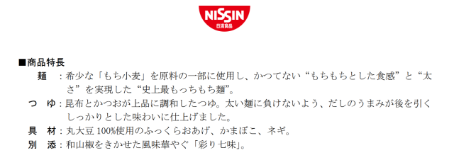 這款泡麵的麵條,採用了 30 % 的麻糬小麥 ( もち小麦 ) ,打造出日清自豪的「最耐嚼」 口感,也讓許多日本網友困惑 : 「這到底好不好吃 ? 」,配上昆布的湯頭及獨門調味,日清也對這個產品非常有信心。