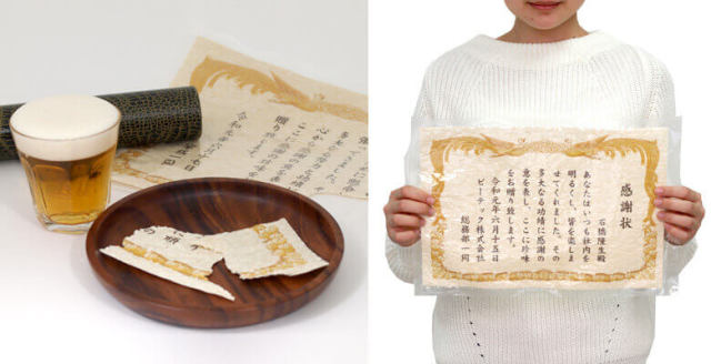 日本針對食物的設計趣味總是讓人充滿驚奇,先前在珍珠奶茶風潮時,就推出了珍珠拉麵、珍珠水餃還有珍珠披薩等等,都讓原創國家感到不可思議或是懼怕 XD。針對日本自己的食物,也有自己的一套玩法。最近日本一家販售零食的店家「ノベルティのお菓子屋さん」推出了一款讓人感到趣味無比的零食「感謝狀 / 表揚狀 燒魚片」,把平常吃的燒魚片印上表揚狀的樣式以及文字,據店家表示能夠用來年末員工表揚或是贈禮。