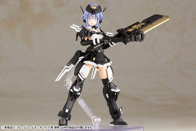 「Frame Arms Girl 六角潮季」套件則沿用「轟雷改 Ver.2」的新版髖關節零件,具備更高的可動範圍。大腿裝甲採用雙球形關節連結,降低裙甲造成的可動干涉。配件附有三種表情零件、多種 PVC 製造型手掌、瞳孔表情水貼紙,能進一步展現角色性格。