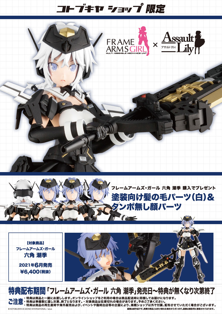 由日本壽屋玩具公司(KOTOBUKIYA)發行的人氣美少女組裝模型系列『Frame Arms Girl 骨裝機娘』今(10)日正式發表與跨媒體作品《Assault Lily 突擊莉莉》的第一彈合作商品「六角潮季」預計於 2021 年 06 月發售的消息。