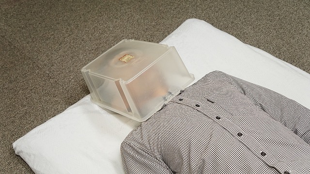 接下來他嘗試的是無印良品的塑膠盒,由於是半透明的關係,他表示光線明顯還是會滲入,覺得睡眠沒有幫助,但是對呼吸來說還算 OK。
