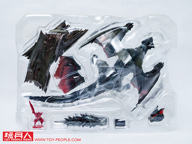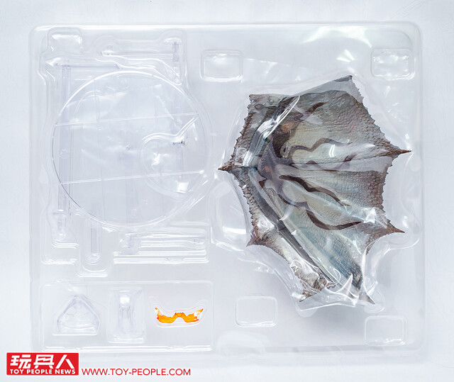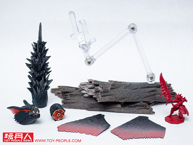 ▼ 配件則包含斷裂木頭台座、可動支架、展開狀態翼膜、發怒狀態頭部、發怒狀態尾部、斷尾再現零件及初回特典的獵人迷你人偶。