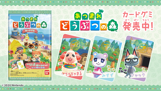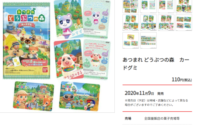 萬代零食事業部推出《集合啦!動物森友會》軟糖,隨包附有27種種類的收藏卡,其中包含人氣島民的介紹卡、島上的風景卡,價格只要110日幣,相信這個開放非限量商品不會造成盜版黃牛炒價才是。