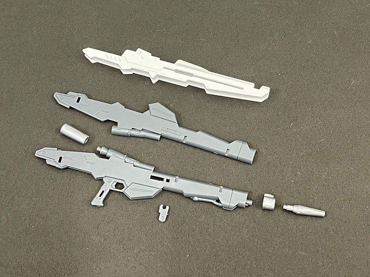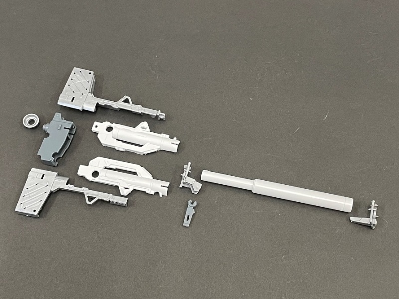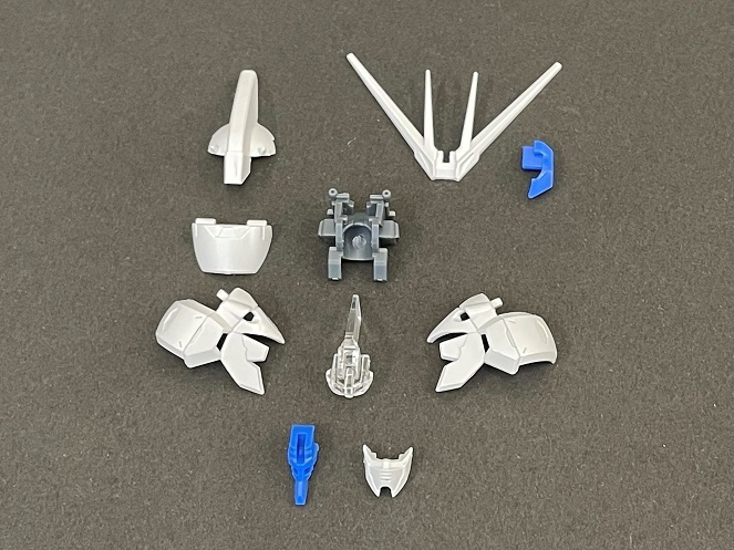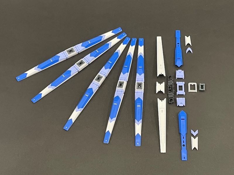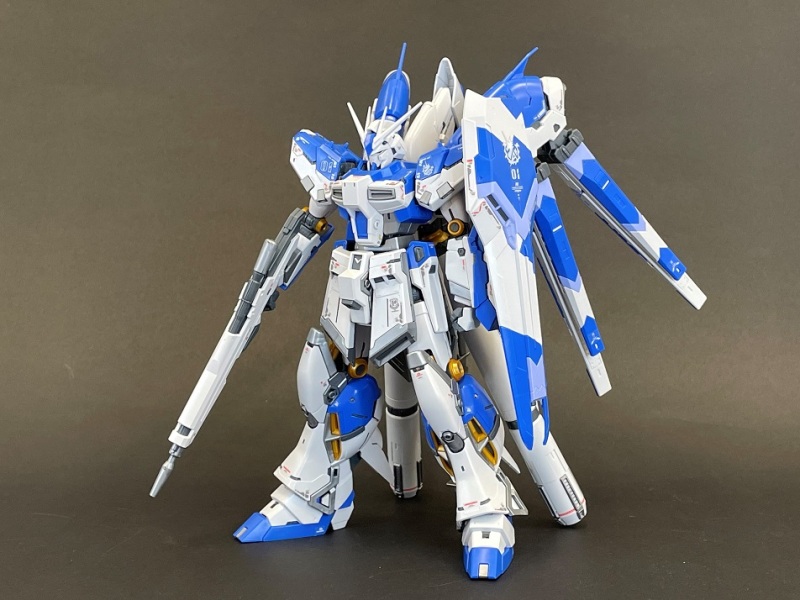 武裝部份附有光束步槍×1、ν・超絕・火箭炮×1、盾牌×1、光束軍刀(柄×3 、光束刃×2)與 6 枚翼狀感應砲,翼狀感應砲使用「Advanced MS Joint」骨架製作,能夠緊實地維持「ㄈ」字形的發射狀態。