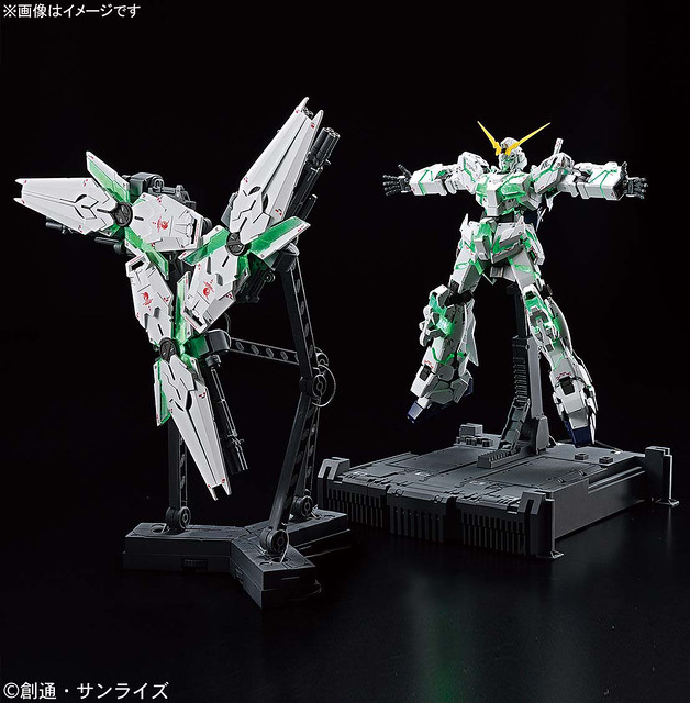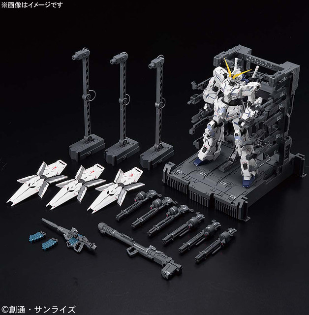 以台場獨角獸鋼彈實物大立像的意象為基礎,重新設計的 MGEX 1/100 獨角獸鋼彈。再現相異的背包造型、附有新規設計的水貼紙!