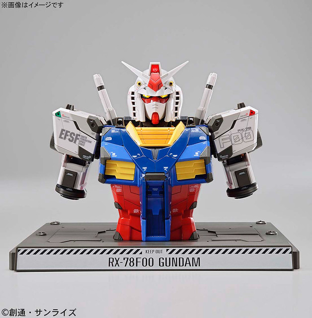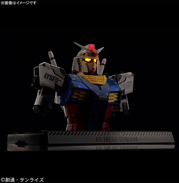 將橫濱會動的實物大「RX-78F00 鋼彈」立像製作成 1/48 比例胸像,忠實再現裝甲造型、色彩、機身標誌,更內藏頭部攝影機的發光機!