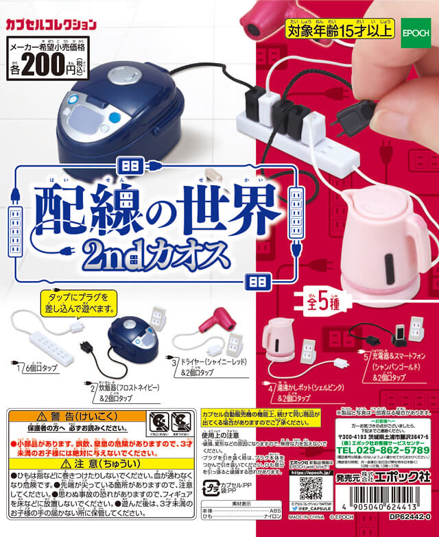 專門推出各式有趣題材轉蛋作品的EPOCH (エポック)品牌,在推出徒增混亂的無厘頭「配線世界」後,竟然又推出人氣第二彈!?「配線世界 2nd 混沌」(配線の世界2ndカオス),以延長線、電器與插座組成的微縮模型作為轉蛋主題,一共五款,一轉參考售價為日幣 200 元,預計將於 2020 年 11 月發售!