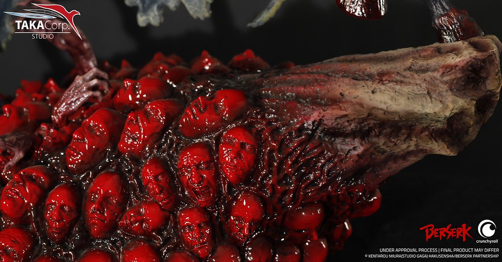 而地台更是在「蝕」的黑夜中,一張張血淋淋的面孔、幽界魔物擬真交織而成,無數痛苦而猙獰的人臉綿延於地大,施以真實感光澤的血紅塗裝,呈現出令人作嘔的顫慄恐怖氣氛,充分展現《烙印勇士》沉鬱黑暗的獨特世界觀。