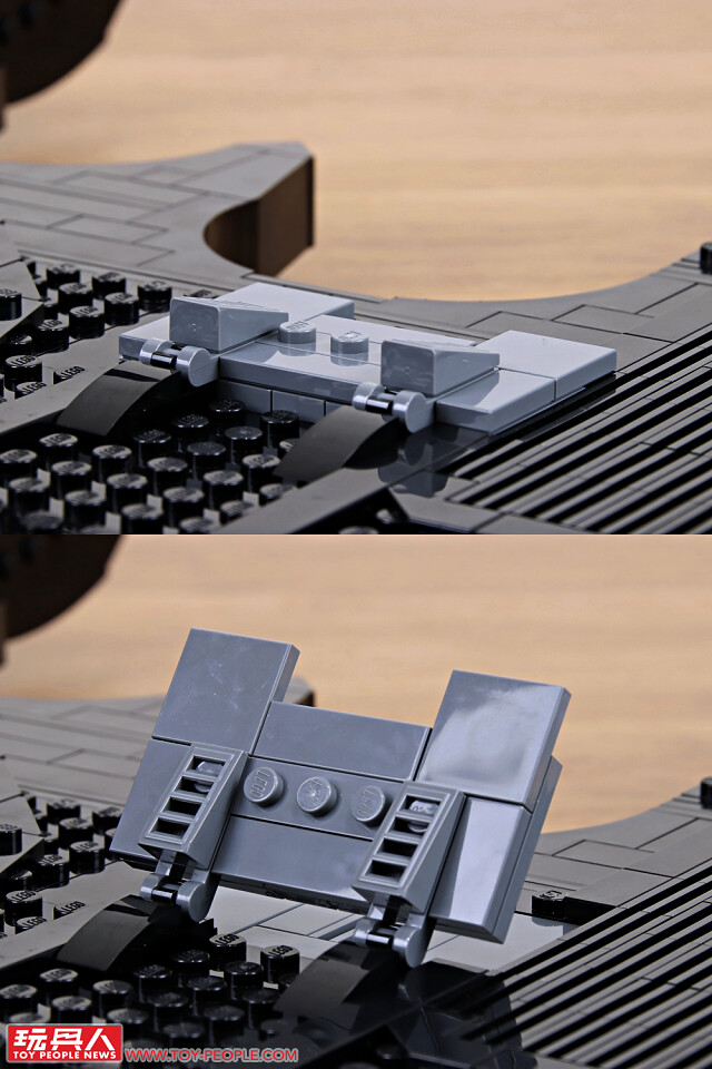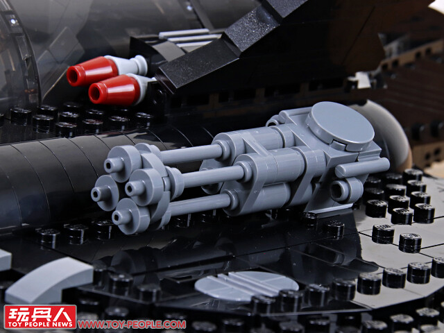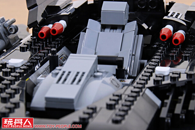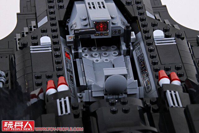 ▼ 接著來看蝙蝠戰機的精彩細節吧!首先是駕駛艙,駕駛艙並不是依照樂高人偶的規格設計,座椅、瞄準鏡可調,整體也因為貼紙的點綴變得豐富,螢幕上還是劇中蝙蝠俠瞄準小丑時的圖樣!