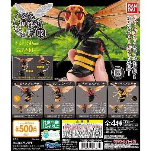日本萬代玩具公司轉蛋事業部 GASHAPON 旗下高人氣的超擬真無殼環保轉蛋,在推出昆蟲圖鑑系列「虎頭蜂」、「鍬形蟲」、「螳螂」等精彩作品後,又將推出第二彈的「大虎頭蜂02(すずめばち02)」轉蛋,共有四種款式,每轉參考售價為 500 日圓,預計將於 2020 年 11 月第五週危險登場!