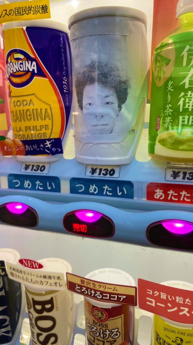 所以到底為什麼要放上一個存在感這麼奇怪又如此強烈的人臉包裝在裡面呢?或許目的可能只是單純為了逗民眾發笑吧,不過這確實也達到了十分驚喜的效果,而且就如un:c桑所拍攝的另一張照片,這罐「人臉飲料」在他購買後,也立即顯示了「已售完」,可見真的很多人因為這張人臉,抱著好奇心而投幣買下了吧XDD