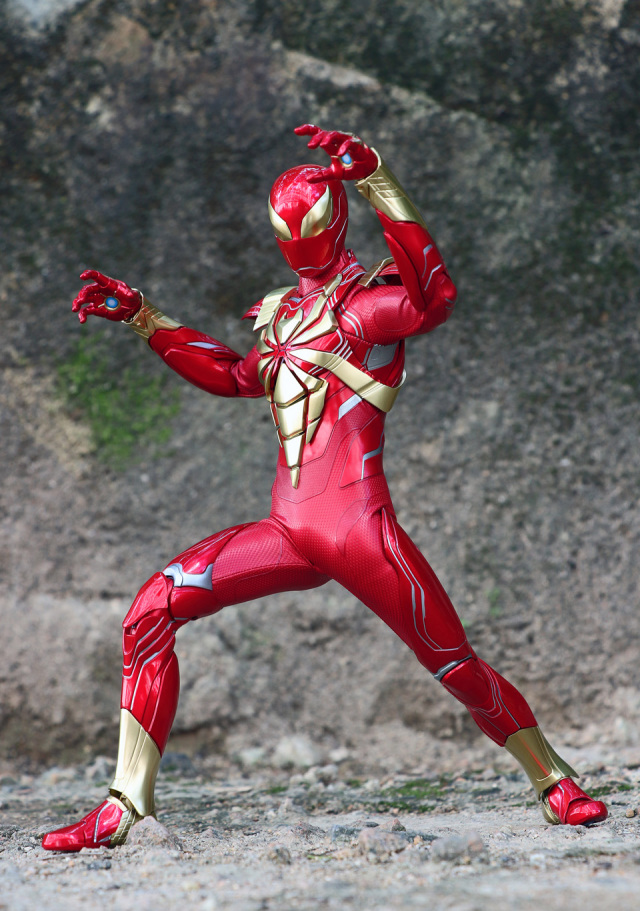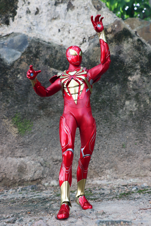 Iron Spider Armor 身形比例很好,緊身戰衣上的胸肌非常吸睛。服飾方面,Hot Toys 採用半布件與半裝甲組件技術足本還原整套紅金色蜘蛛俠戰衣,胸前配有呈立體感的巨型金色蜘蛛圖案,各個裝甲組件刻劃上銀色線條,充滿高科技感。外衣亦完美呈現了遊戲中的外套質材、標誌及各細節,表面也展現出金、紅二色的金屬色效果。QC Good,我個人覺得外型是全《Marvel’s Spider-Man》系列最靚的作品!