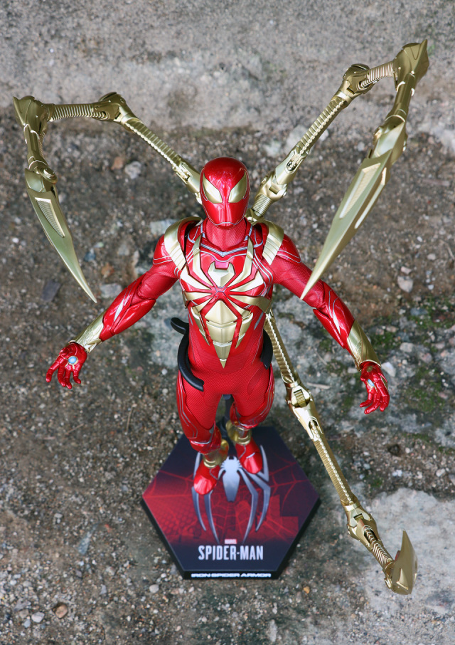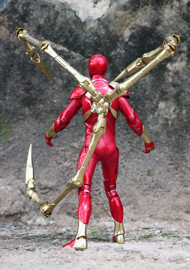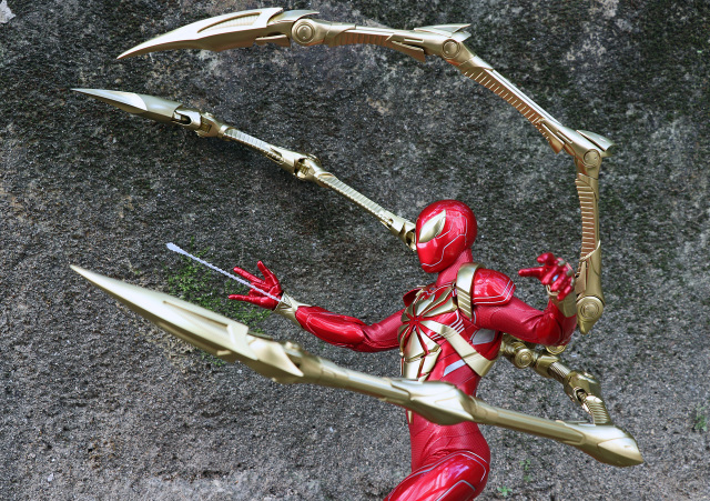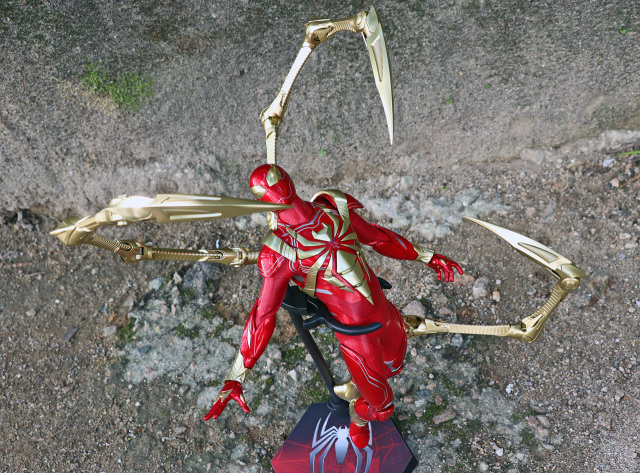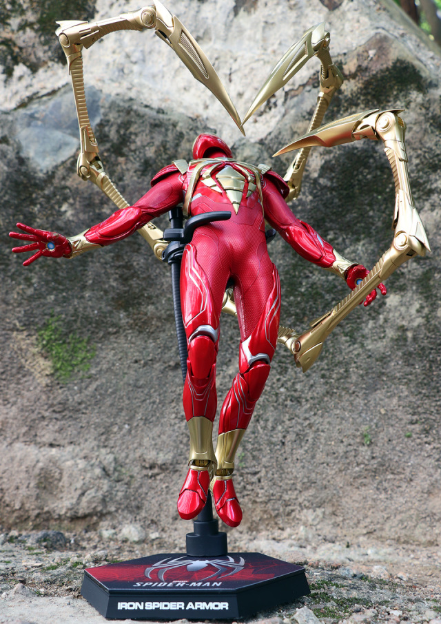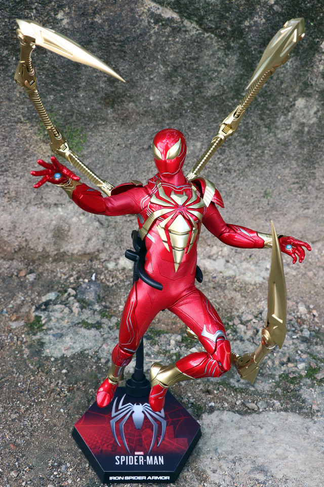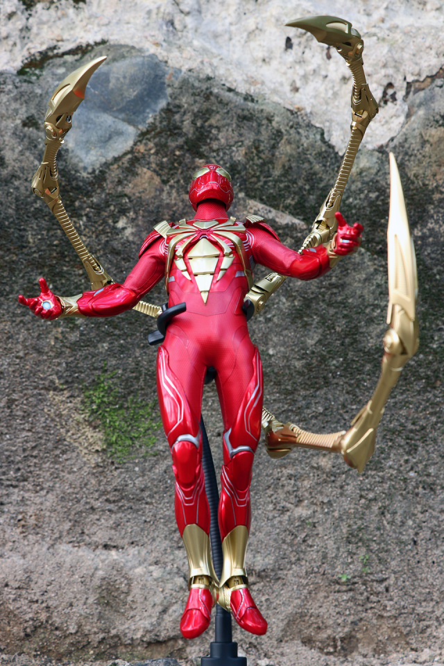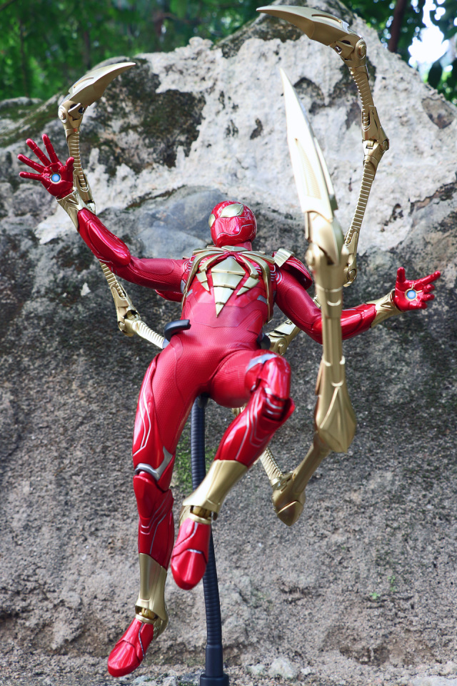 扭動關節時 (特別是手肘及大腿),你必須留意外甲與皮套有否干涉,另不建議你儘情地扭玩..... 總之玩之前先看看說明書吧!而裝上機械蜘蛛爪後必須配合台座把玩。另外衣服材質絕對是一個問題...... 雖未至 Iron Spider 般會很快退色,但其耐久性依舊成疑......