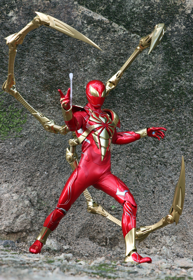 人偶高約 30 公分,全身約有 30 處可動關節。配件包括一對蛛絲發射器、6 條蜘蛛絲、專用台座、多款替換手型、蜘蛛網型特效配件與金色巨爪等。而每支機械蜘蛛爪都有 4 個活動關節。故可玩性不俗!