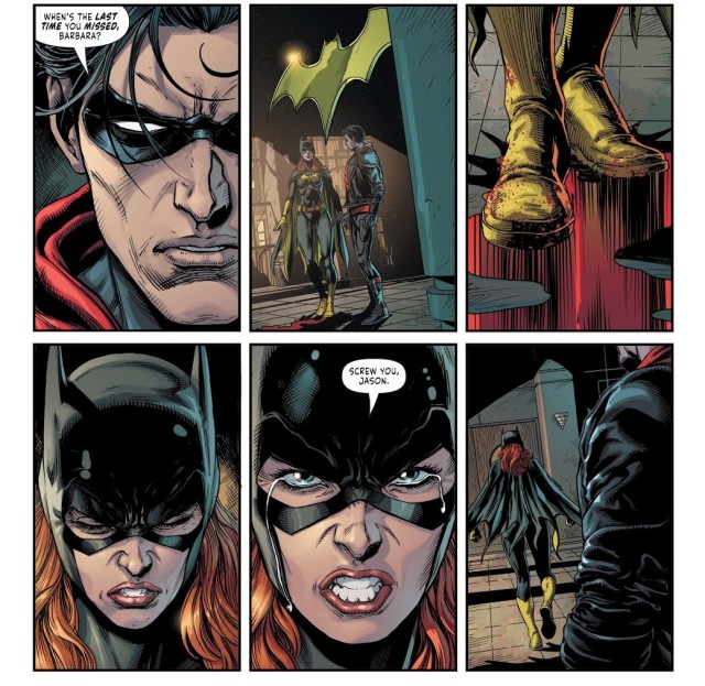 就好比同樣受到小丑凌虐的傑森與芭芭拉,傑森後來成為了「復仇者」紅頭罩,至於芭芭拉則是將這股恨意藏在心中,時時刻刻以正義來勸戒自己的那個復仇心。以至當芭芭拉看見傑森能夠為了自己下痛手,她又何嘗不希望自己也能做到替自己報仇雪恨,而對於傑森而言,他又何嘗不羨慕芭芭拉能夠做到將仇恨吞進肚裡,也或許正因為這份羨慕,也讓傑森對芭芭拉起了愛慕之心。