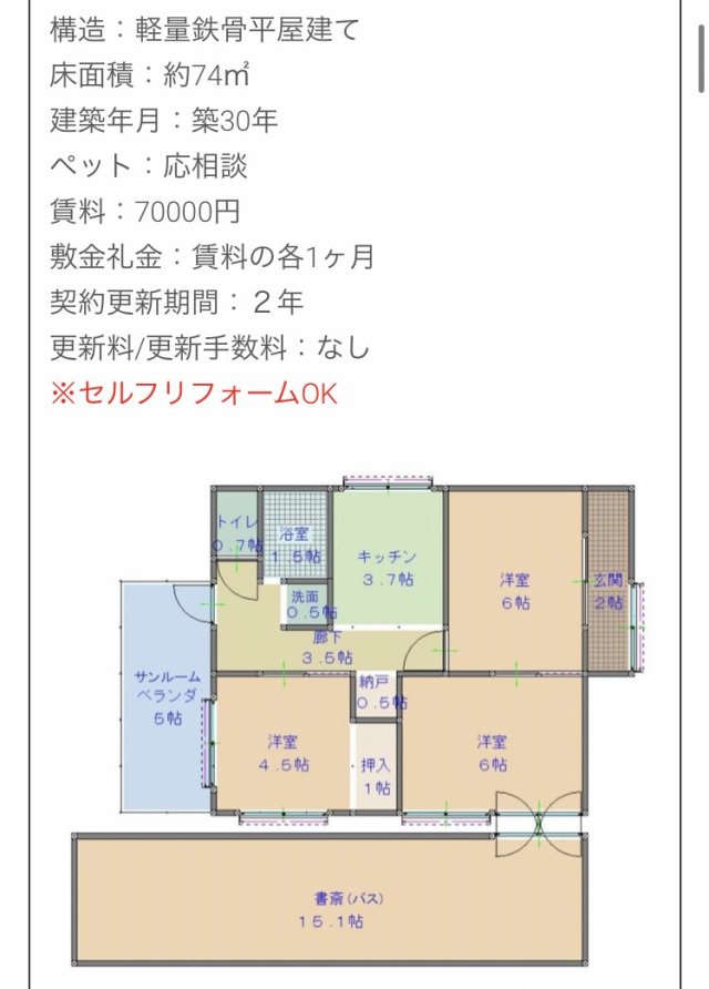 另外房東也有附上房屋介紹,可以看到月租要 70,000 日幣,格局上最讓許多網友無法理解的「巴士 = 書齋」。原來房東是把巴士當書齋阿 XD,甚至比房屋內其他地方的格具都大上許多,這個書齋的地位可說是尊爵不凡呢。
