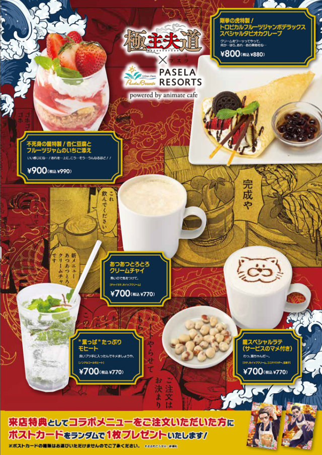 這次合作餐廳將推出漫畫中出現的菜色,包含「任俠蛋包飯」、「檸檬蜂蜜醃雞肉三明治」、「阿龍漢堡排套餐」、「鋼拳之虎特製!熱帶水果可麗餅佐珍珠」與「不死身阿龍特製! 草莓杏仁豆腐」等菜色。