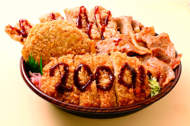 升級過後的MEGA碗 2000 Power便當!裡面配料除了米飯 300g 以外,還有炸豬排 1 片、龍田炸雞 1 片、炸高麗菜餅 1 個、生薑燒肉 1 份,共計 4 種肉料理,這份量絕對吃到撐!