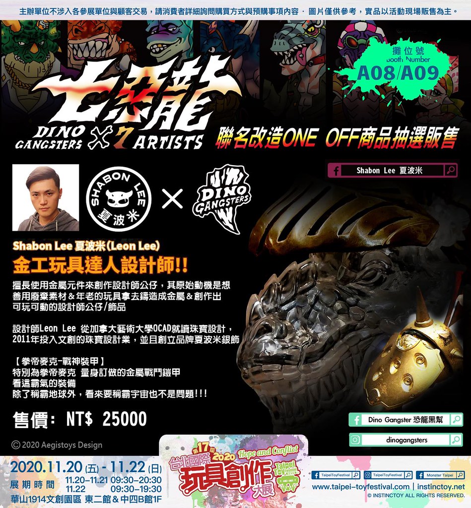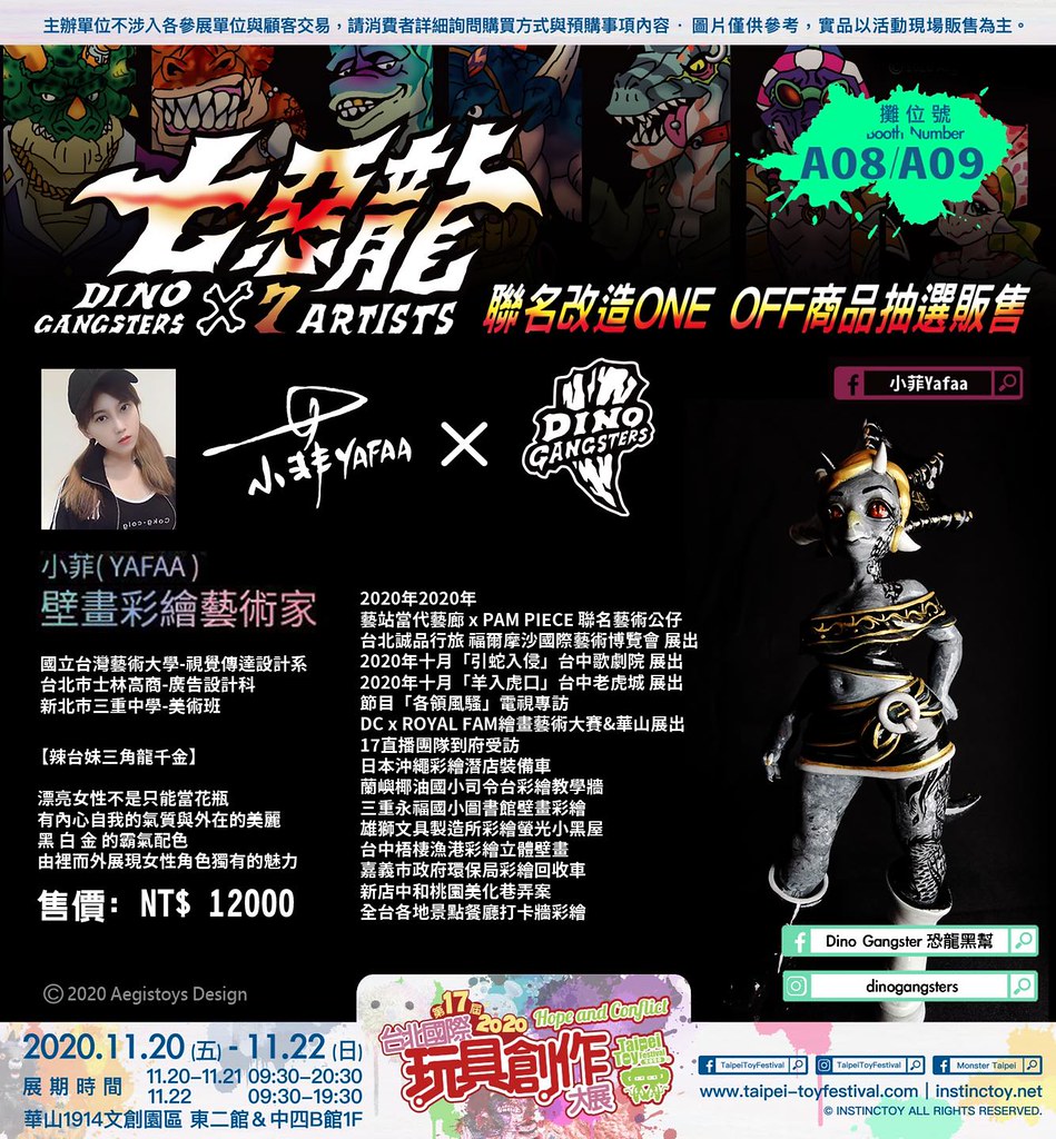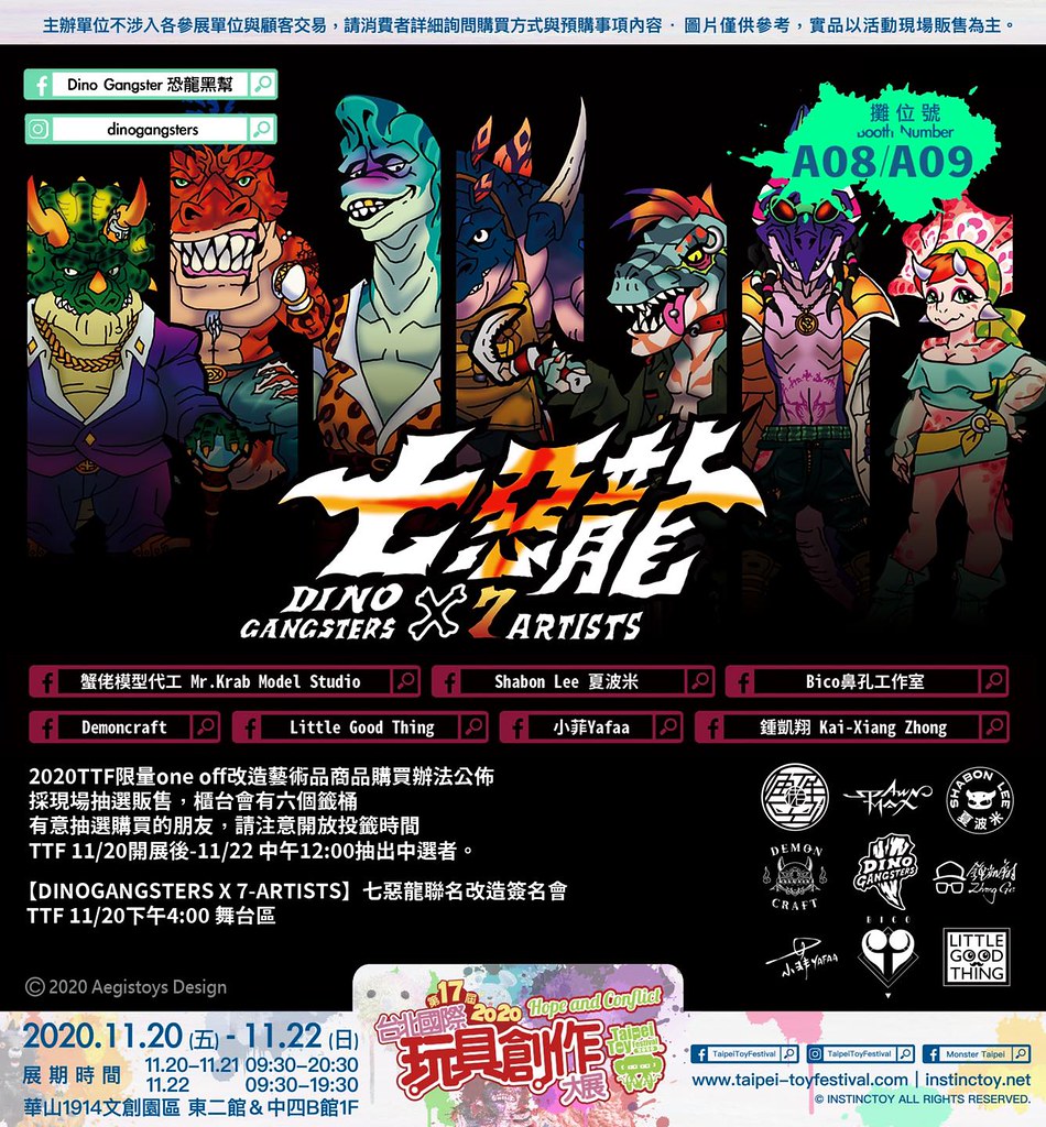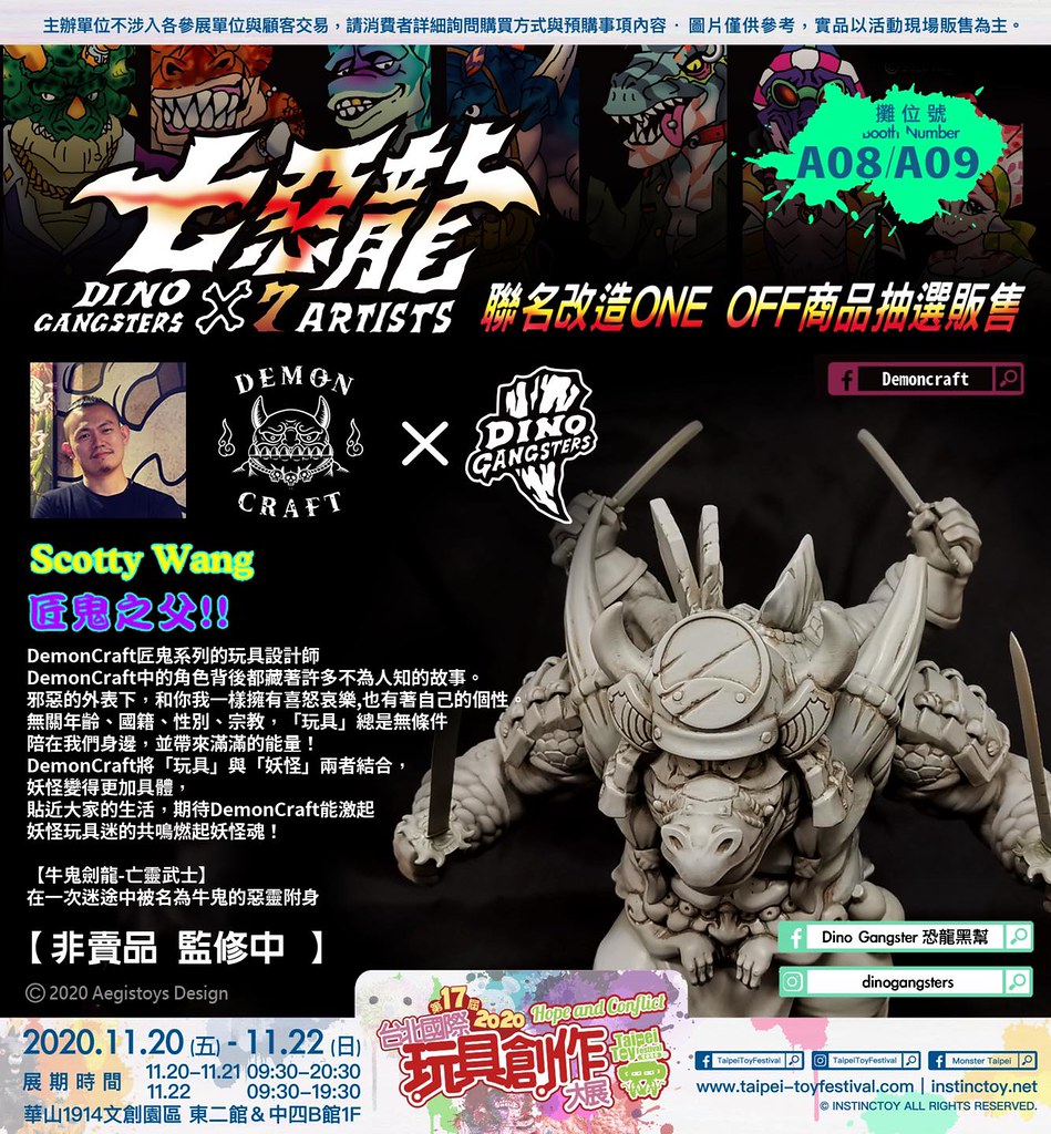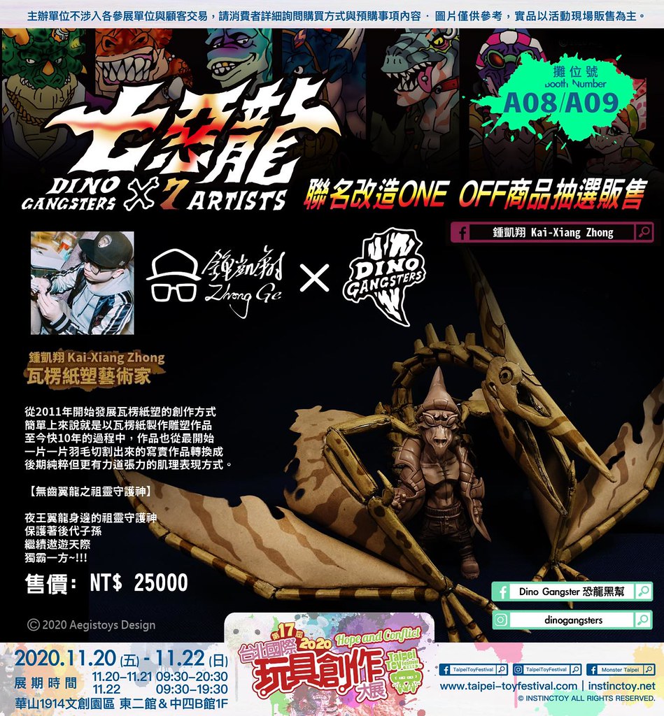 首次參戰玩具盛事-第 17 屆TaipeiToyFestival 台北國際玩具創作大展(TTF 2020)就帶來精彩的恐龍黑幫【DINOGANGSTERS X 7-ARTISTS】2020TTF 限量one off改造藝術品商品「無齒翼龍之祖靈守護神」,以及與玩具設計團隊 Infinity Toy 合作的《剝奪仔·犀角》紙塑原件&搪膠樣品首次公開展出!