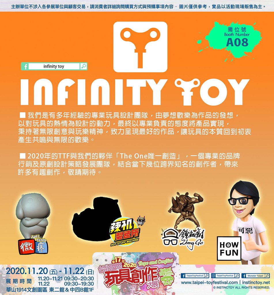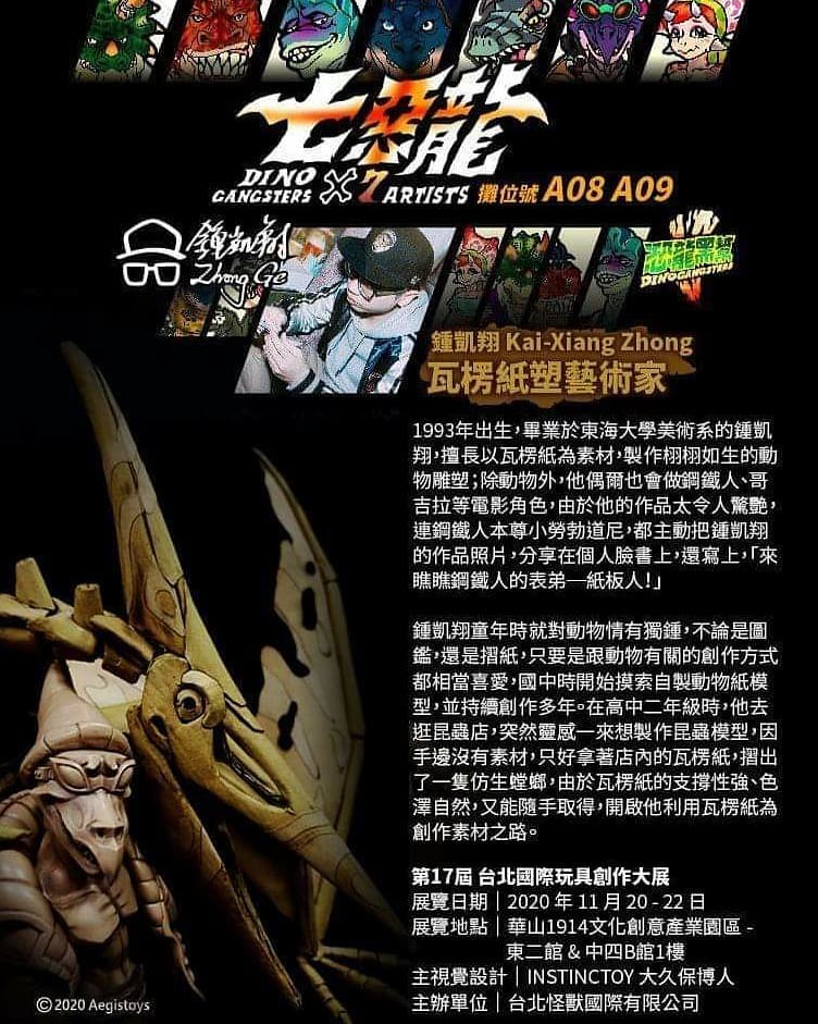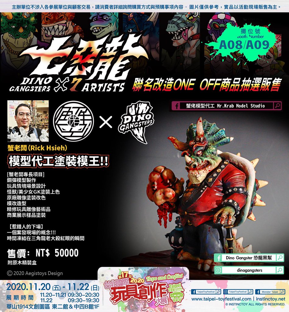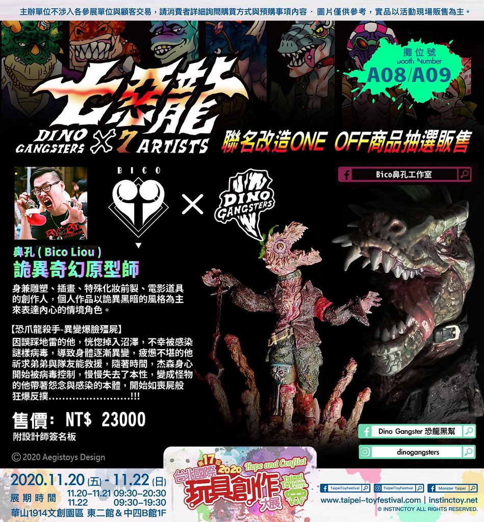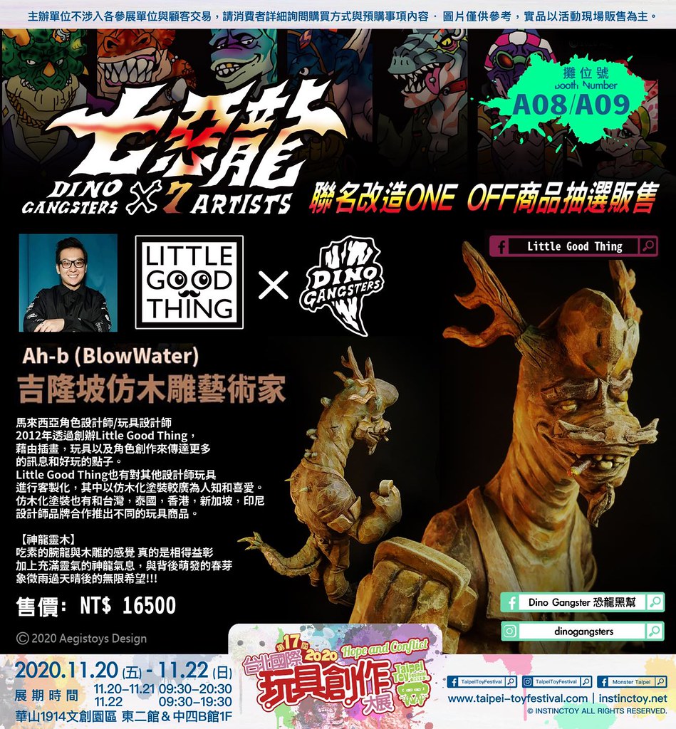 首次參戰玩具盛事-第 17 屆TaipeiToyFestival 台北國際玩具創作大展(TTF 2020)就帶來精彩的恐龍黑幫【DINOGANGSTERS X 7-ARTISTS】2020TTF 限量one off改造藝術品商品「無齒翼龍之祖靈守護神」,以及與玩具設計團隊 Infinity Toy 合作的《剝奪仔·犀角》紙塑原件&搪膠樣品首次公開展出!
