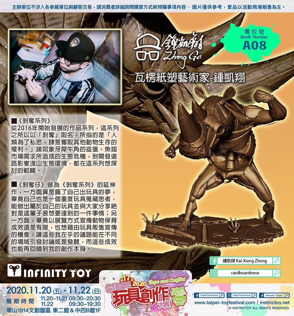 另外,鍾凱翔更首度與玩具設計團隊 Infinity Toy 合作,將 2016 年開始發展的個人創作《剝奪系列》延伸作《剝奪仔》玩具化啦!除了大魄力的《剝奪系列·犀角》作品將會於 A08 攤位展示,令人期待的全新作品《剝奪仔·犀角》紙塑原件&樣品也將首次公開展出!(※會場僅展示樣本,商品將另行生產販售)