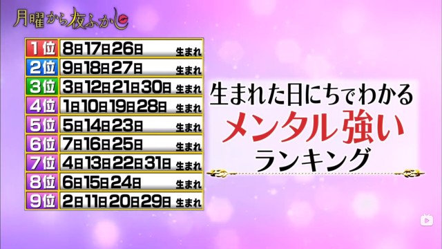 我們在報章雜誌上常常會看到一些心理測驗,或是星座占卜、生肖占卜,或是血型占卜等,看檢測看看自己是不是符合占卜測驗上所說的這一類人,而最近由「關8」村上信五、松子DELUXE所主持的日本綜藝節目《月曜夜未央》(又譯:有的沒的調查局),在本週節目尾聲時,玩起了一個講述「心靈堅強」的占卜排行榜。