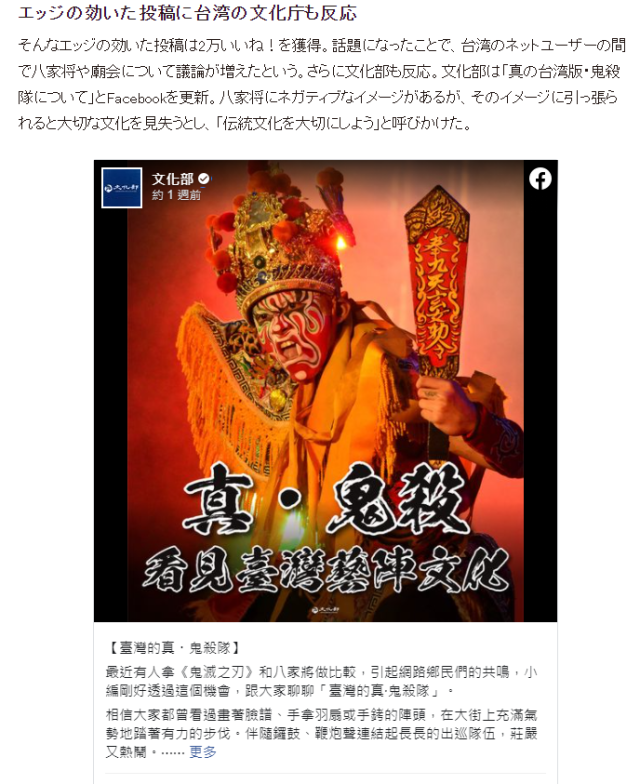 根據日媒《まいどなニュース》報導指出,他們將台灣八家將稱之為「台灣版鬼殺隊」,並且詳細用日文翻譯出圖片中的中文字,指出日台「鬼殺隊」兩邊的相似之處,而日本網友還很認真地探究兩邊文化的不同,更一本正經地表示台灣的「鬼神」概念與日本大不相同。