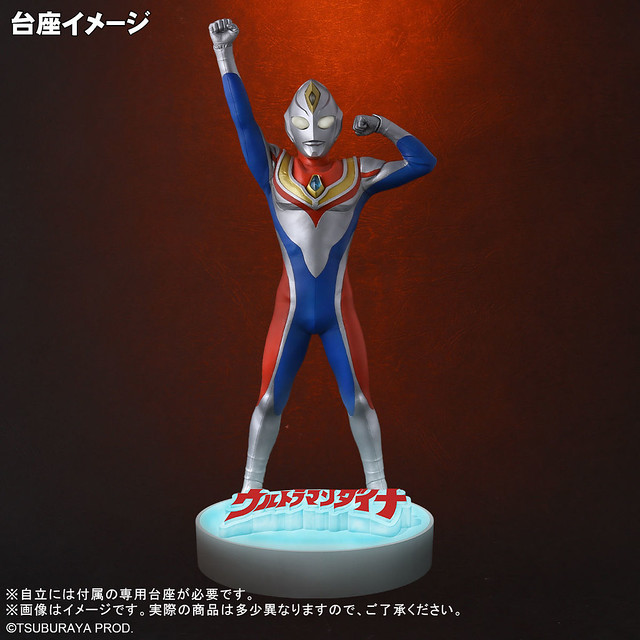 這款 RMC PLUS 所推出的超人力霸王帝納之立體人形雕像,同樣以帝納在劇中右手高舉的登場姿勢來呈現,眼睛與胸口訊號的標誌處,皆採用透明材質製作,內藏有 LED 燈之發光裝置,底座的部分也有「ウルトラマンダイナ」之字樣,整體組合起來,其 31 公分之高大尺寸,加上發光效果,真的是相當有氣勢啊!