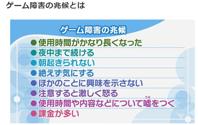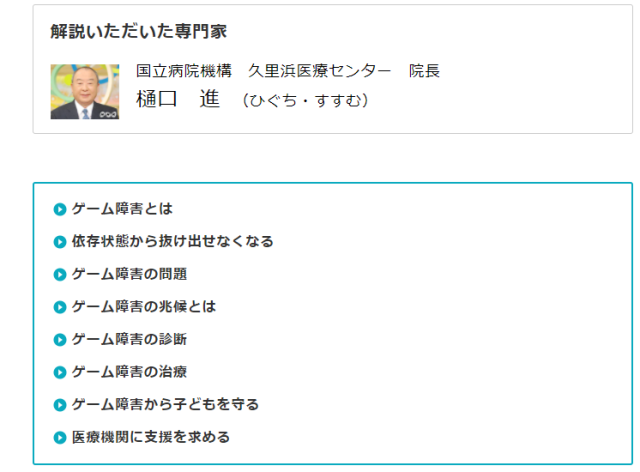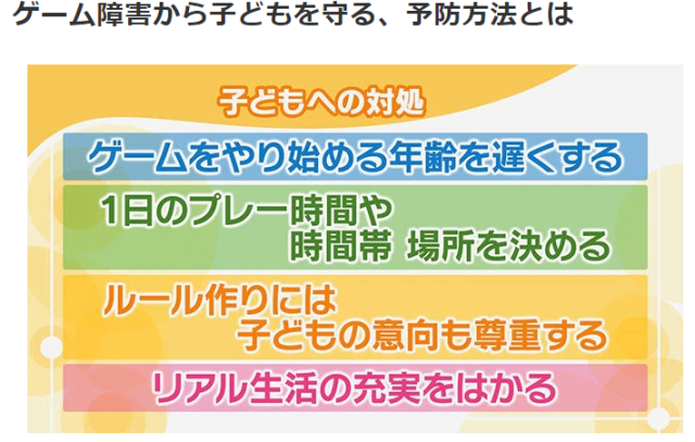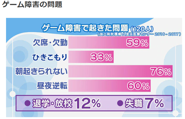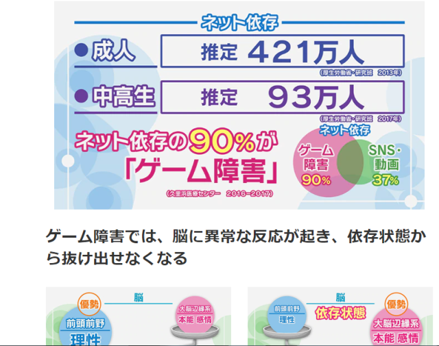 近期NHK報導再次邀請神奈川縣橫須賀市的國營醫院作調查,並與樋口進院長介紹「遊戲成癮」造成的危害研究,其對象通常為24歲以下男性,且「遊戲成癮」造成生活困擾長達1年以上,並在自制力差的學生擴散,危害身心與家庭關係,「應該與整個社會建構起對策」,甚至公開腦部結構改變的追蹤資料。
