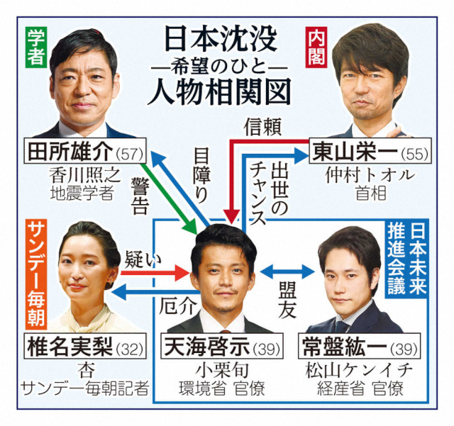 另外先前公布的小栗旬、香川照之,以及杏等三位演員,則分別飾演「天海啓示」、「田所雄介」與「椎名實梨」,故事背景則是設定在2023年的未來,日本將發生一場極具毀滅性的重大災難。