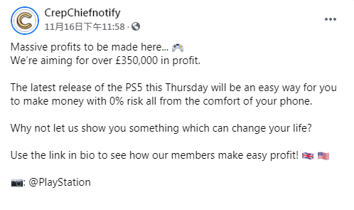 CrepChiefNotify由千人付費會員集合而成,而除了使用黃牛方案營利之外,更投放廣告鼓吹玩家們註冊後轉賣主機,表示這個過程能馬上獲得3800臺幣(以上),當然商業流程下,公司最後還是最大贏家。