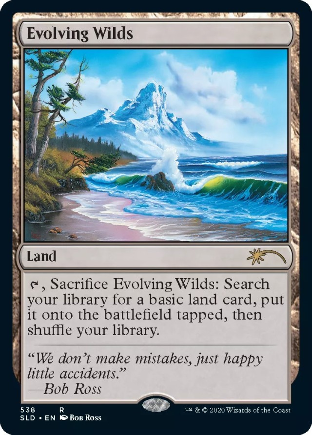 事實上,這次《魔法風雲會》所推出的限量卡包「Happy Little Gathering」,為了紀念鮑伯魯斯,不僅採用了他最為擅長的風景畫來做為卡組的基本牌外,連同卡片「成形野地(Evolving Wilds)」也將換成他的圖畫,並且在下方的文字欄位中,都還有他的名言”We don’t make mistakes,just happy little accident.”