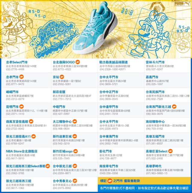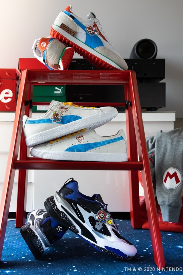 全新 SUPER MARIO 3D ALL-STARTS™ by PUMA 收藏輯系列共推出 Future Rider Super Mario 64、RS-Fast Super Mario Galaxy、RS-Dreamer Super Mario Galaxy、RS-Dreamer Super Mario Sunshine 與 Clyde Super Mario Sunshine 五款聯名鞋款,結合超級瑪利歐遊戲經典元素,以超級瑪利歐(Super Mario)3D All-Stars遊戲為主題設計,在球鞋中加入了瑪利歐的招牌紅藍配色、遊戲道具、遊戲場景等巧思!