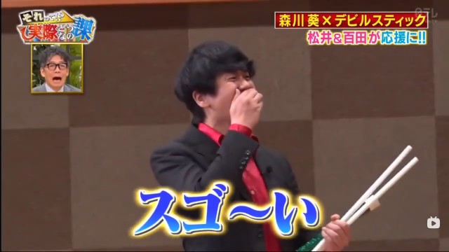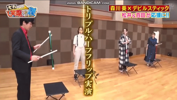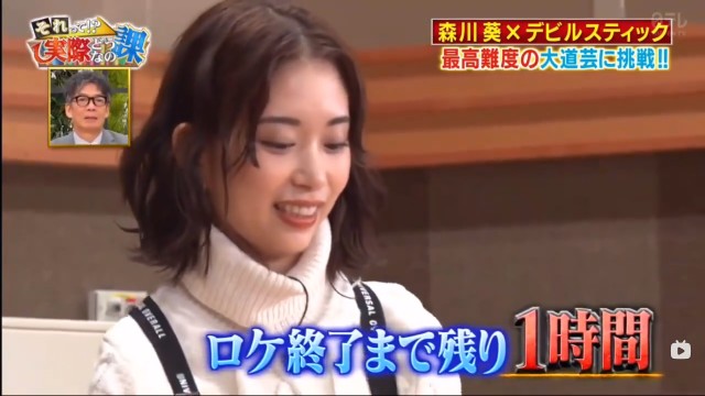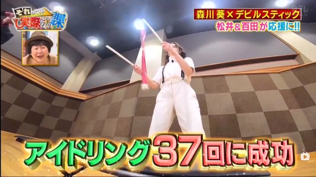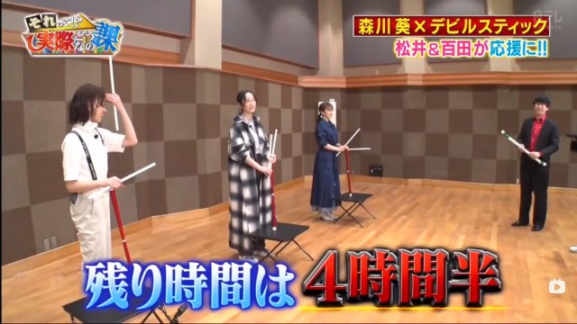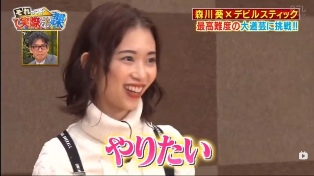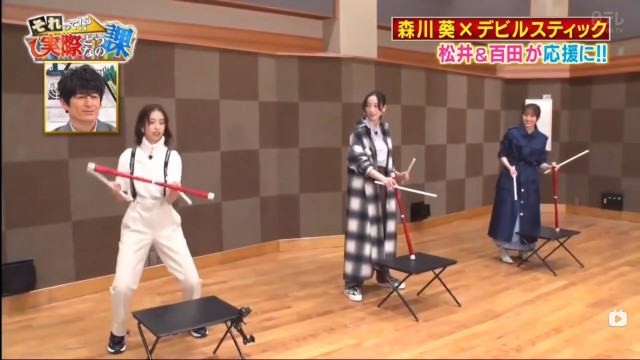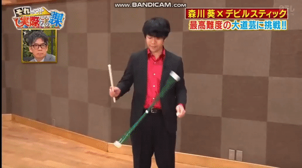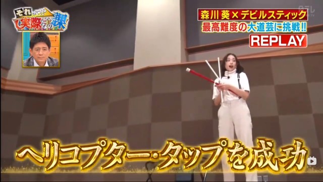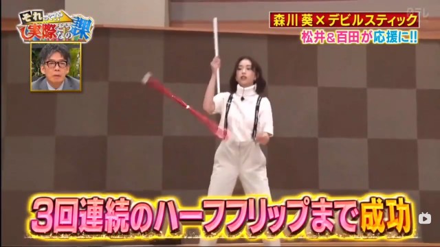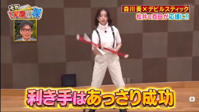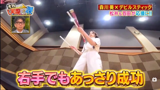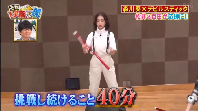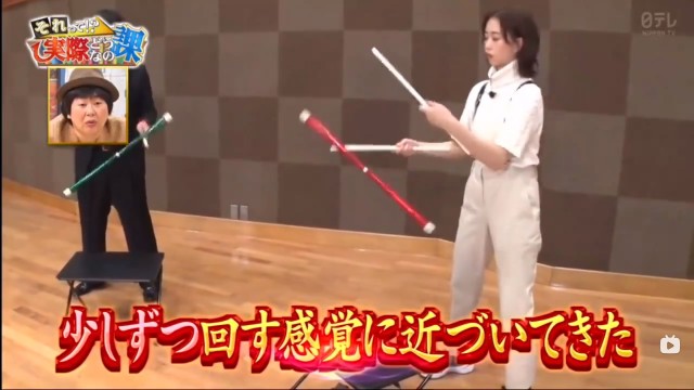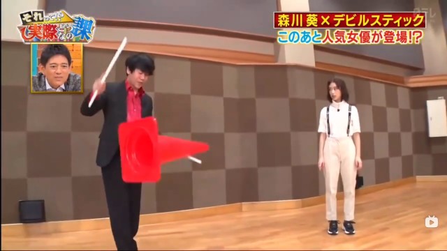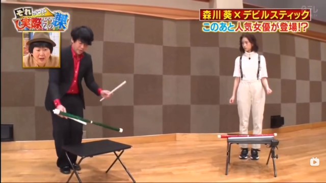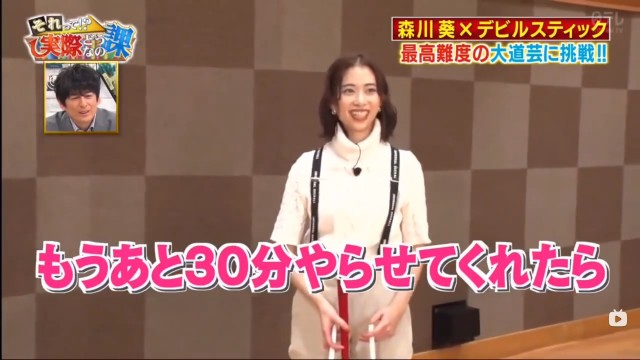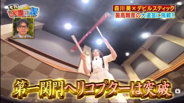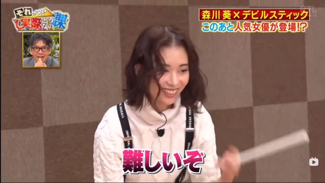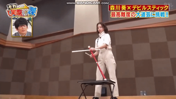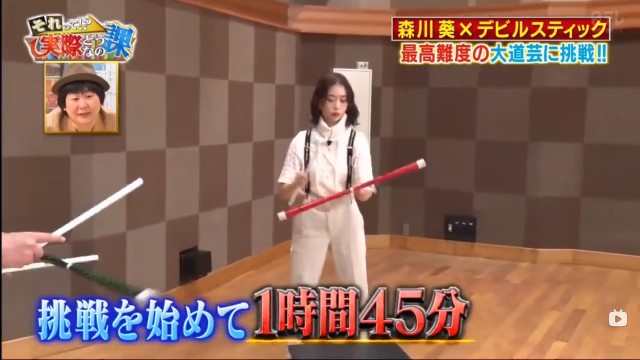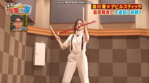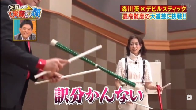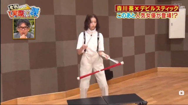 在日前的《それって 実際どうなの課》節目中,替森川葵安排了一項叫做「惡魔棍」的一種雜技表演,是利用兩根棍棒不斷甩動第三根棍子的一種超絕技能,一般人要練到最頂尖,都還得花上五年的時間才能熟練功夫,學習力一向超強的森川葵也做好準備,接下了這個頂尖任務!
