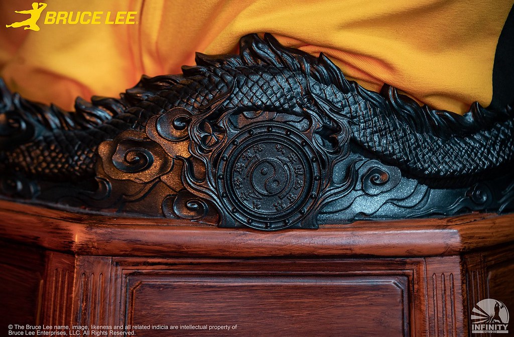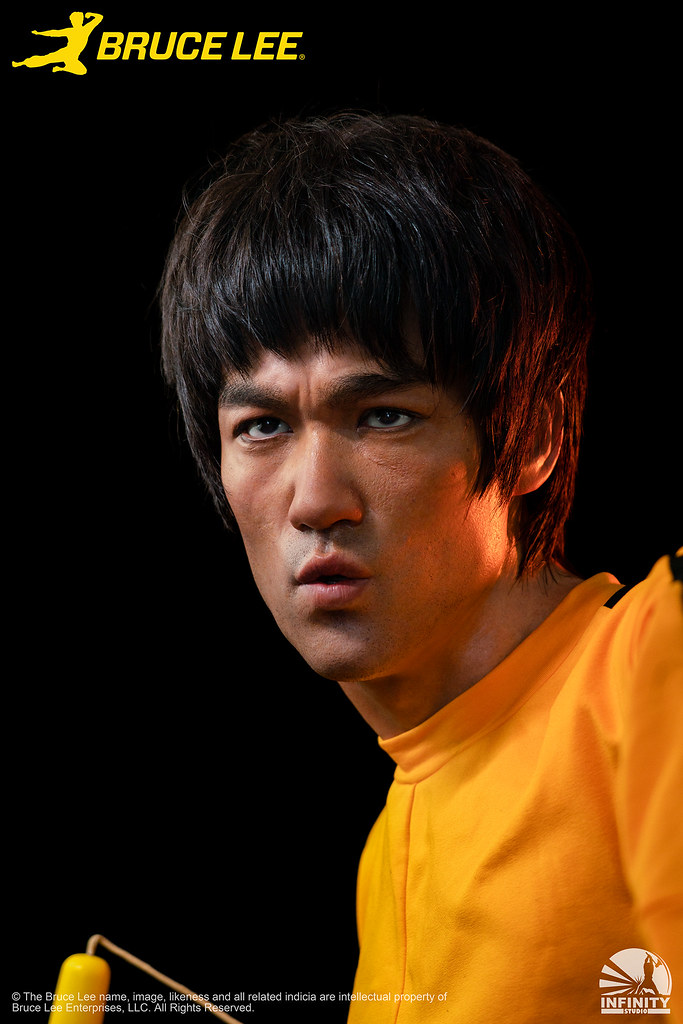 李小龍在遺作電影《死亡遊戲》中,身穿黃底、黑條紋運動服,手持雙截棍的造型,不僅成為世界影史中最經典的形象之一,如今也是全球聞名的流行文化符號。此次Infinity Studio 製作的「《死亡遊戲》李小龍 1:1 比例胸像」,採用劇中的招牌造型,以李小龍屏氣凝神、手持雙截棍隨時準備出手的姿態擬真打造,為約 75 公分高的份量感尺寸, 逼真形塑李小龍的表情,採用矽膠植髮技術純手工植入的頭髮,皮膚則是使用鉑金矽膠(Platinum Silicone)製作,展現出宛如真人般膚質紋理與細紋,手上的筋、血管等細節更是精緻呈現;雕像的義眼為專門定制,眼神散發出堅毅的神韻,使整體真實感再提升!