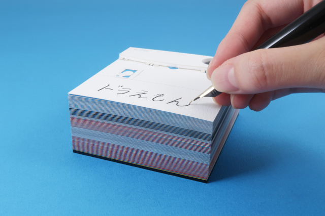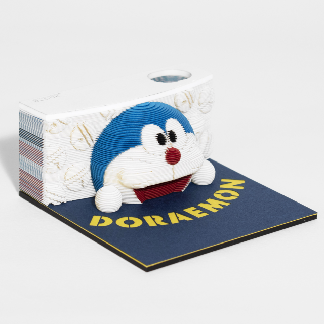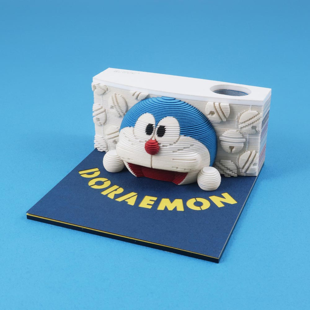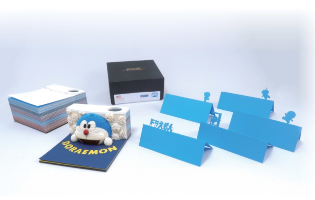 除了將哆啦A夢的藍色大頭以刻工仔細、精美分色的紙雕還原,背景更是有立體的鈴鐺造型,而在便條紙上更有任意門、哆啦A夢LOGO字樣等鏤空雕刻,處處顯現出日本職人的巧思。