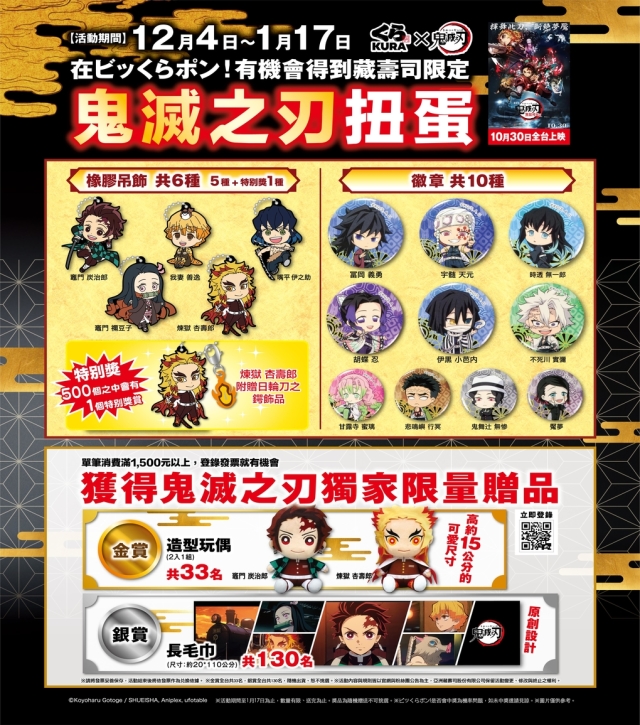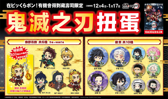 官方日前宣布「藏壽司聯名鬼滅之刃扭蛋/金銀賞」即將在 12 月 4 日登場!活動除了推出五款:炭治郎、禰豆子、善逸、伊之助與大哥杏壽郎的「橡膠吊飾」+一款 1/500 中獎機率的特別獎「煉獄杏壽郎 日輪刀鍔 飾品」,以及包含鬼殺隊、鬼王無慘與魘夢的十款「徽章」之外,還有豐富的限定活動贈品、消費滿額禮!鬼滅粉準備好吃起來了嗎~~