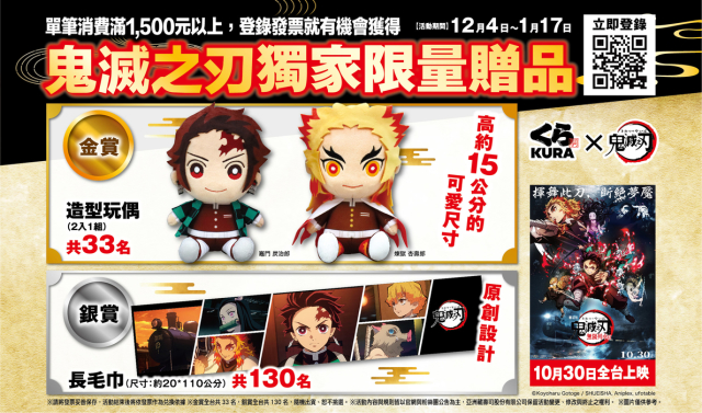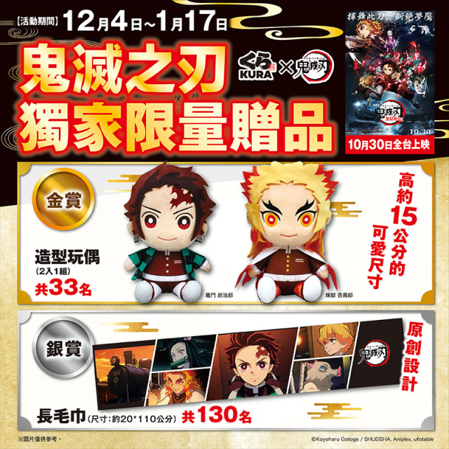 ▼登錄發票抽限量鬼滅之刃周邊商品~炭治郎&煉獄杏壽郎兩位主角Q 版造型玩偶登場!還有原創長毛巾~